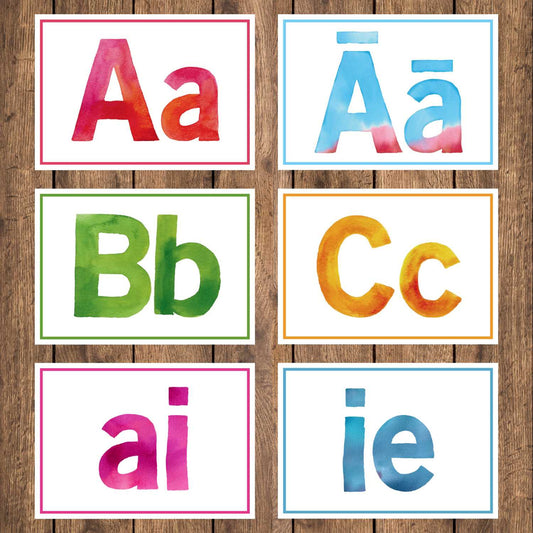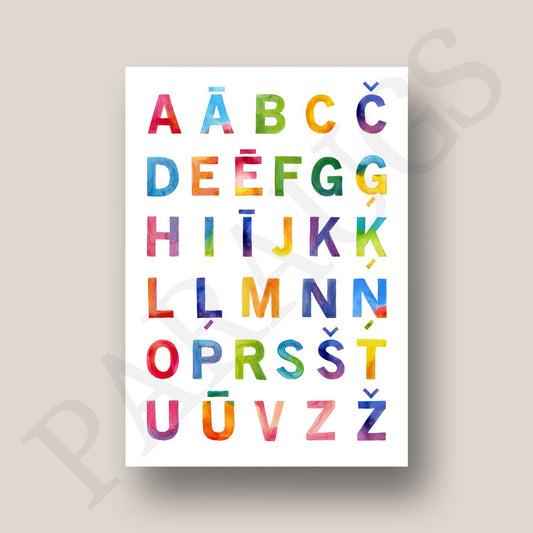 Rakstīto burtu alfabēts ar bultiņām - patskaņi un līdzskaņi