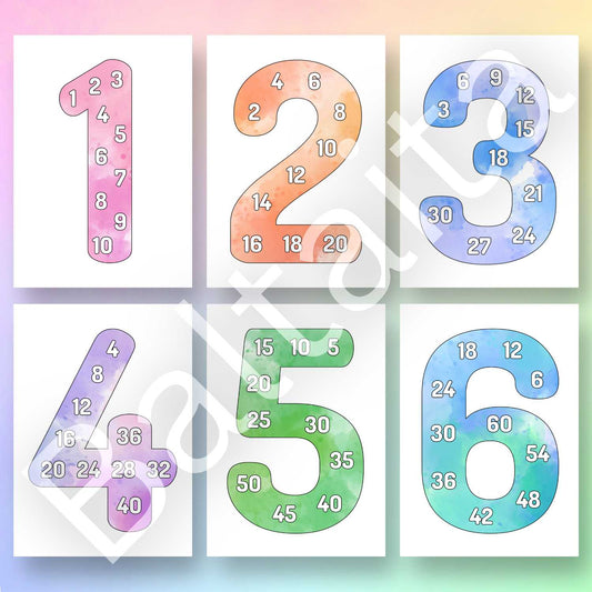 Ciparu plakāti - ūdenskrāsu, reizināšanas atgādne, ar baltiem cipariem