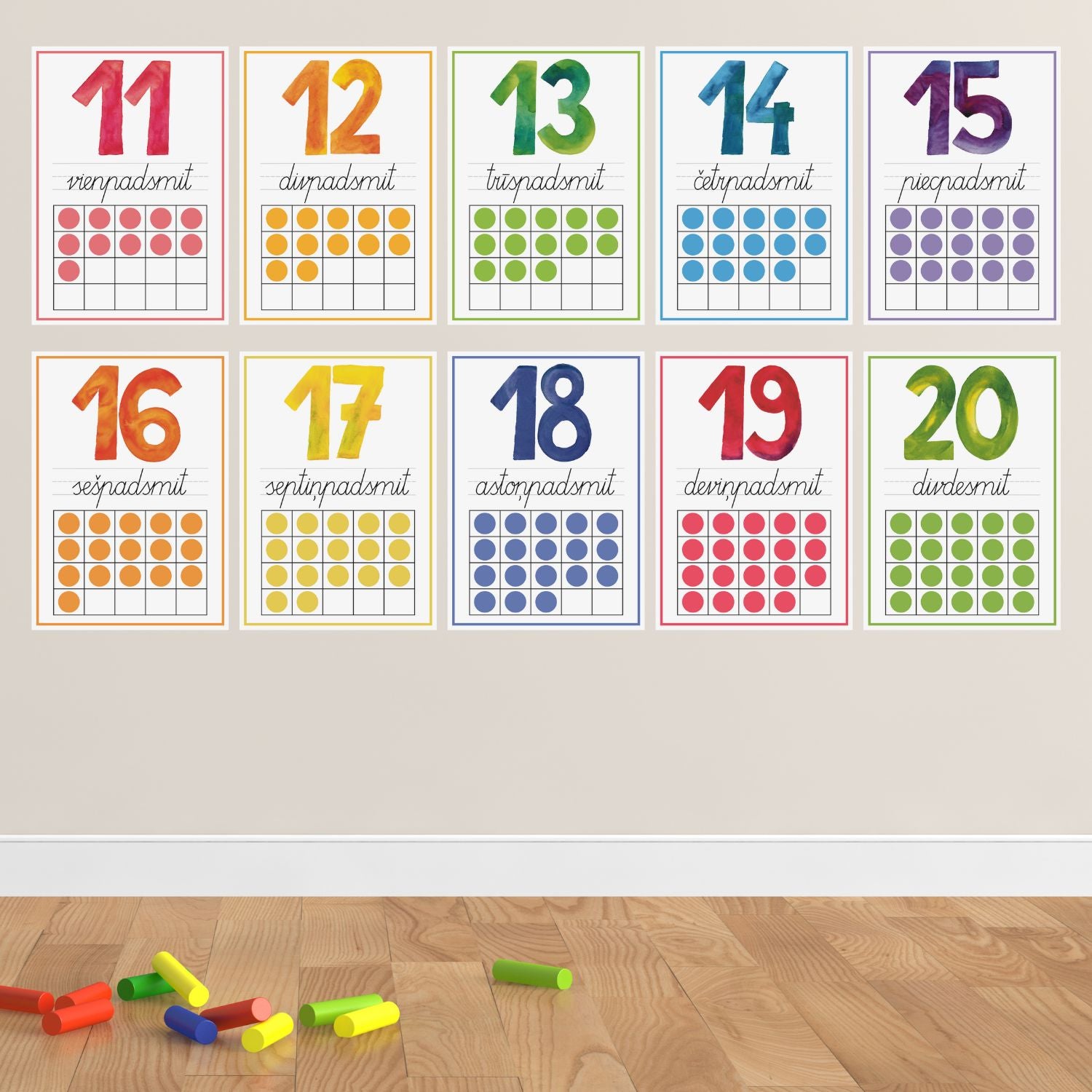 Ienes krāsu un ciparus telpā vienlaicīgi ar šiem krāsainajiem plakātiem.