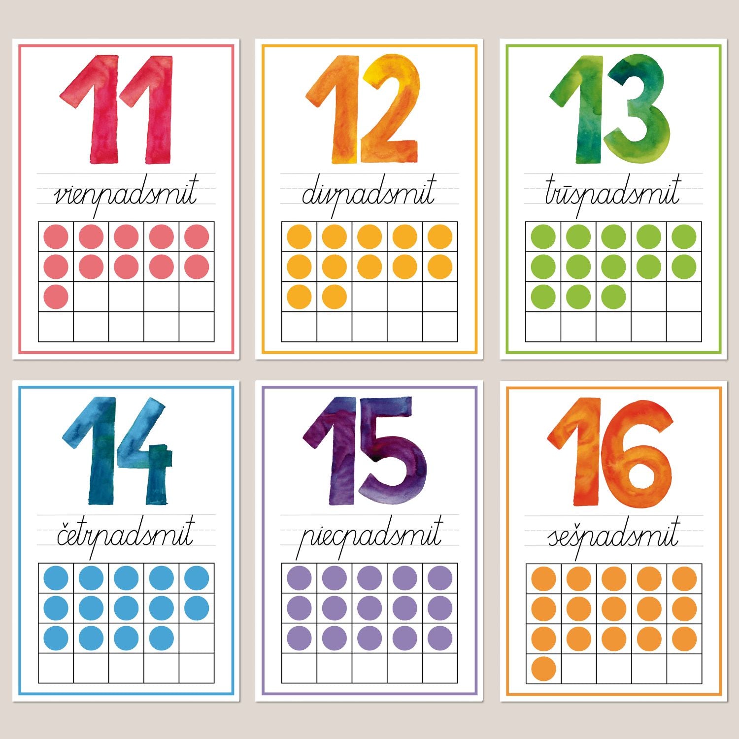 Apkārt katram plakātam ir rāmītis līdzīgā krāsā kādā ir cipars.