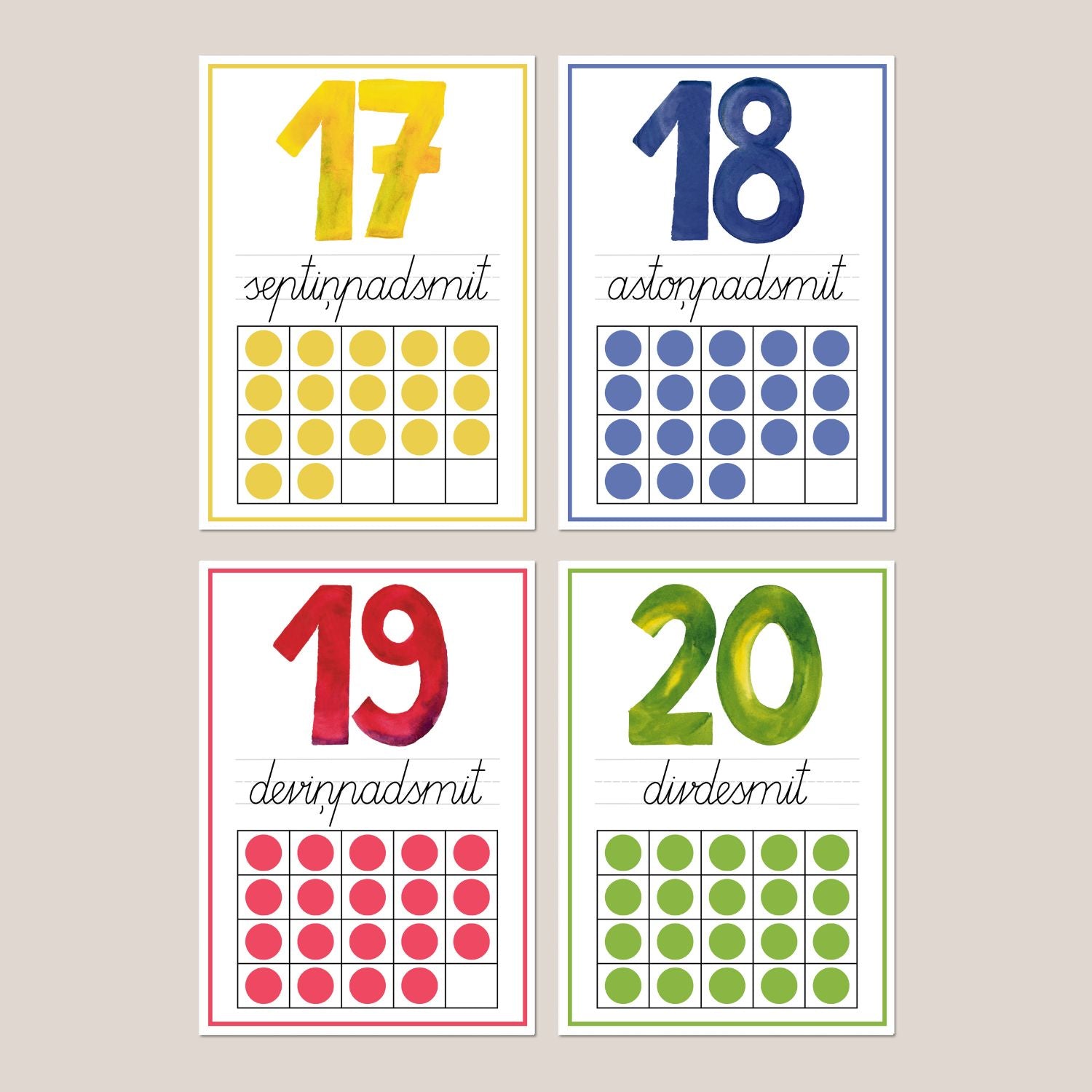 Katrs plakāts veidots ar lielu ūdenskrāsu ciparu augšpusē, zem tā – latviešu rakstu mazajiem burtiem uzrakstīts nosaukums un zemāk ir grafiski attēlots skaits katram ciparam kuru var izmantot kā skaitīšanas treniņu.