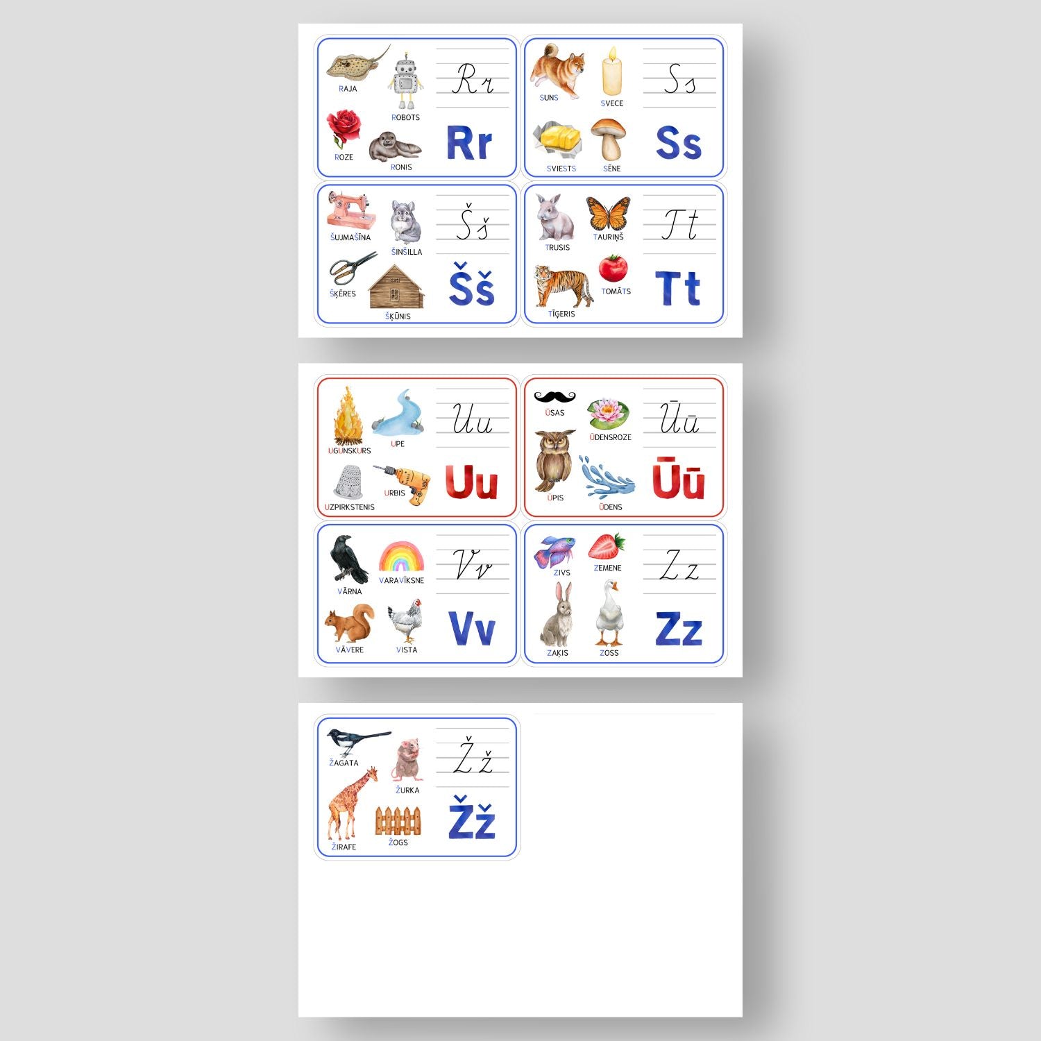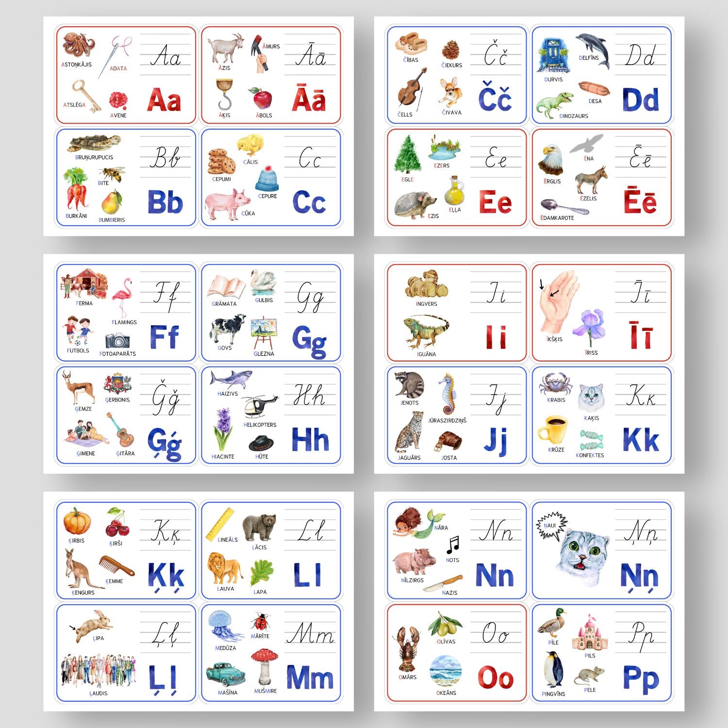 Katra alfabēta kartīte ietver rakstītos, lielo un mazo, latviešu alfabēta burtus, lielo un mazo iespiedburtus, attēlus, kuri sākas ar doto burtu un attēlu nosaukumus.