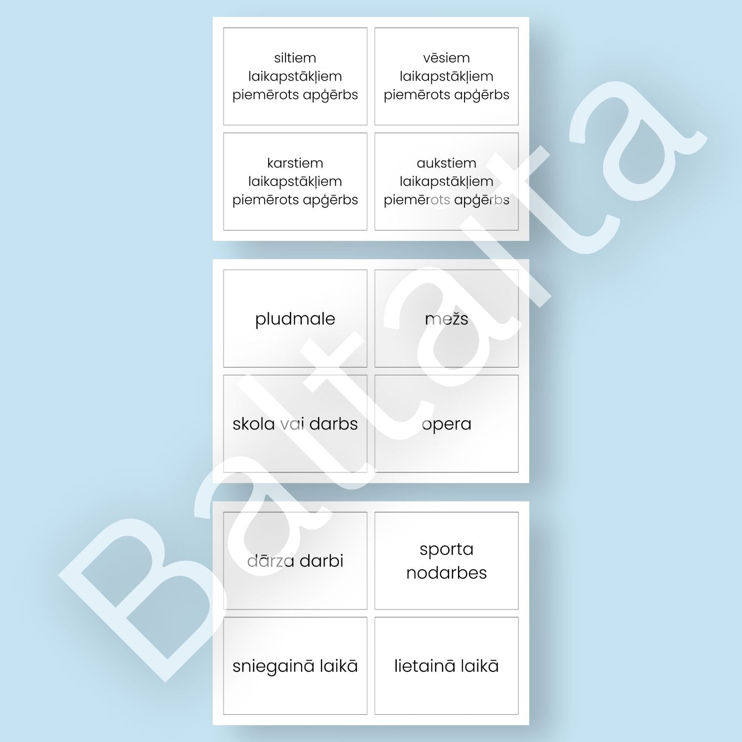 Šī mācību materiāla beigās atradīsiet trīs lapas ar dažādām grupēšanas uzdevumam paredzētām kartītēm.