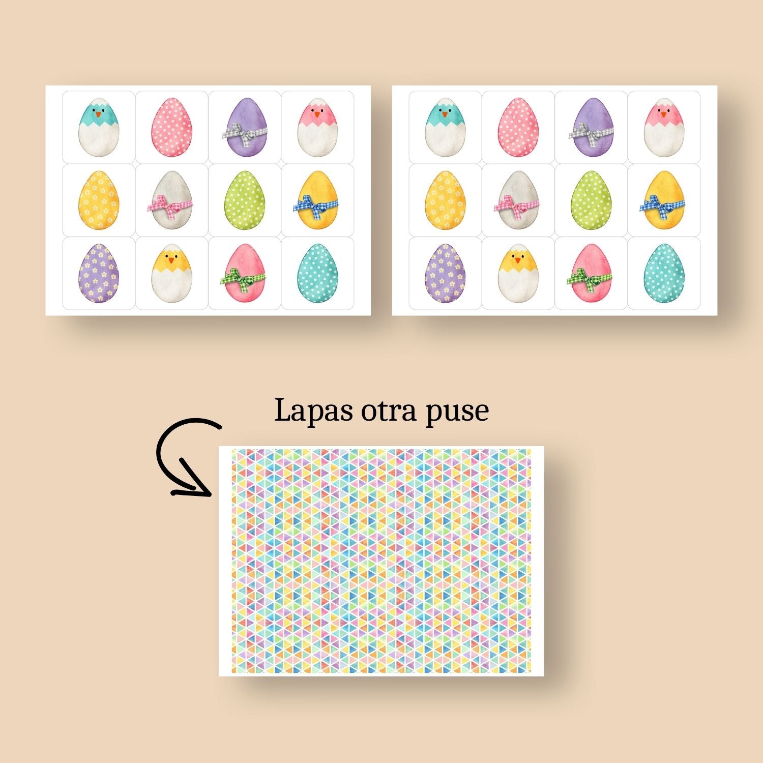 Spēle veidota ar dažādām krāsainām Lieldienu olām un krāsainu kartīšu aizmuguri.