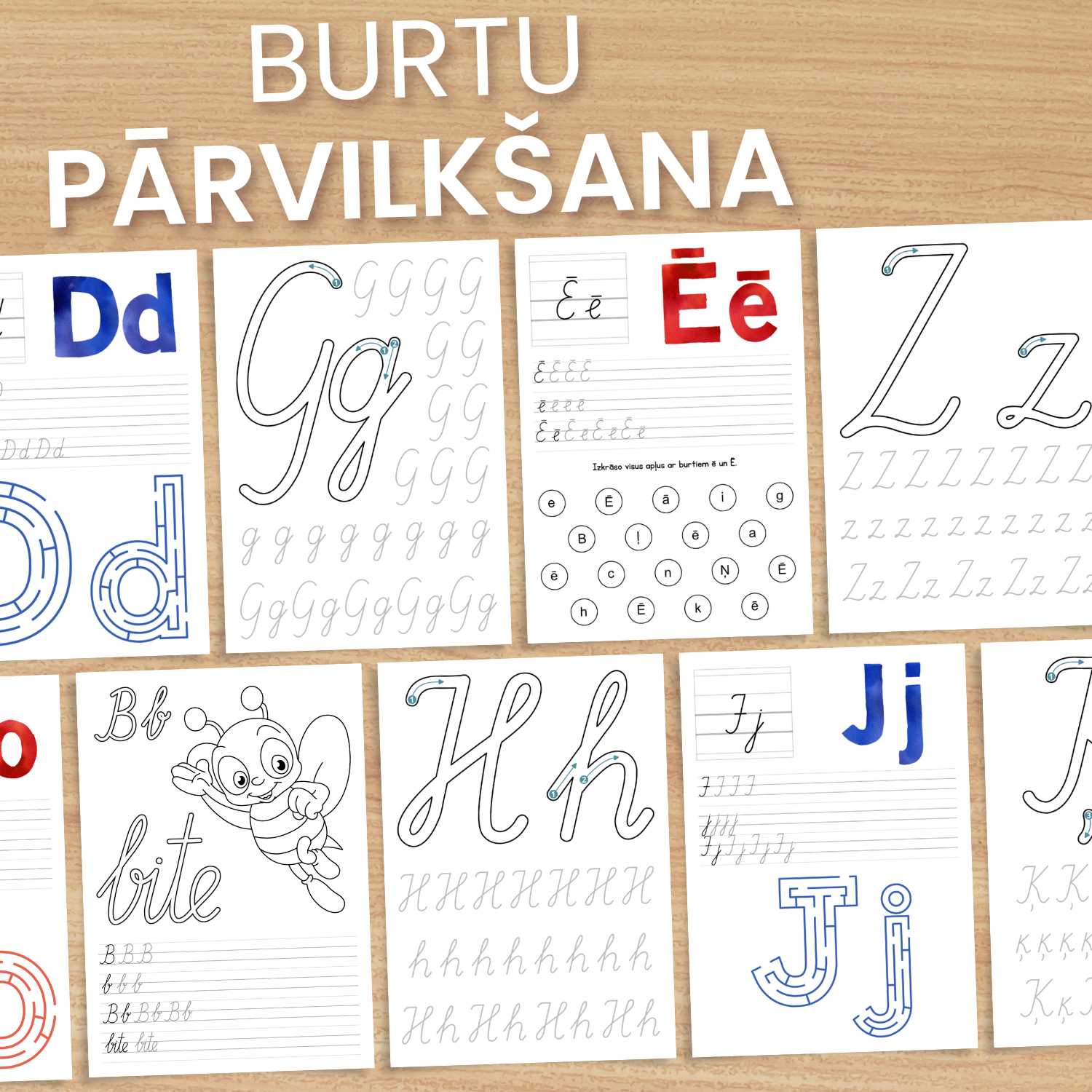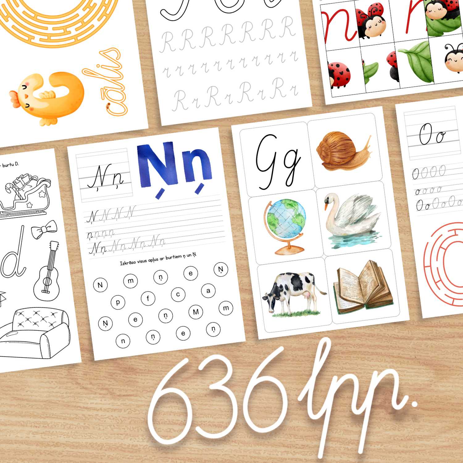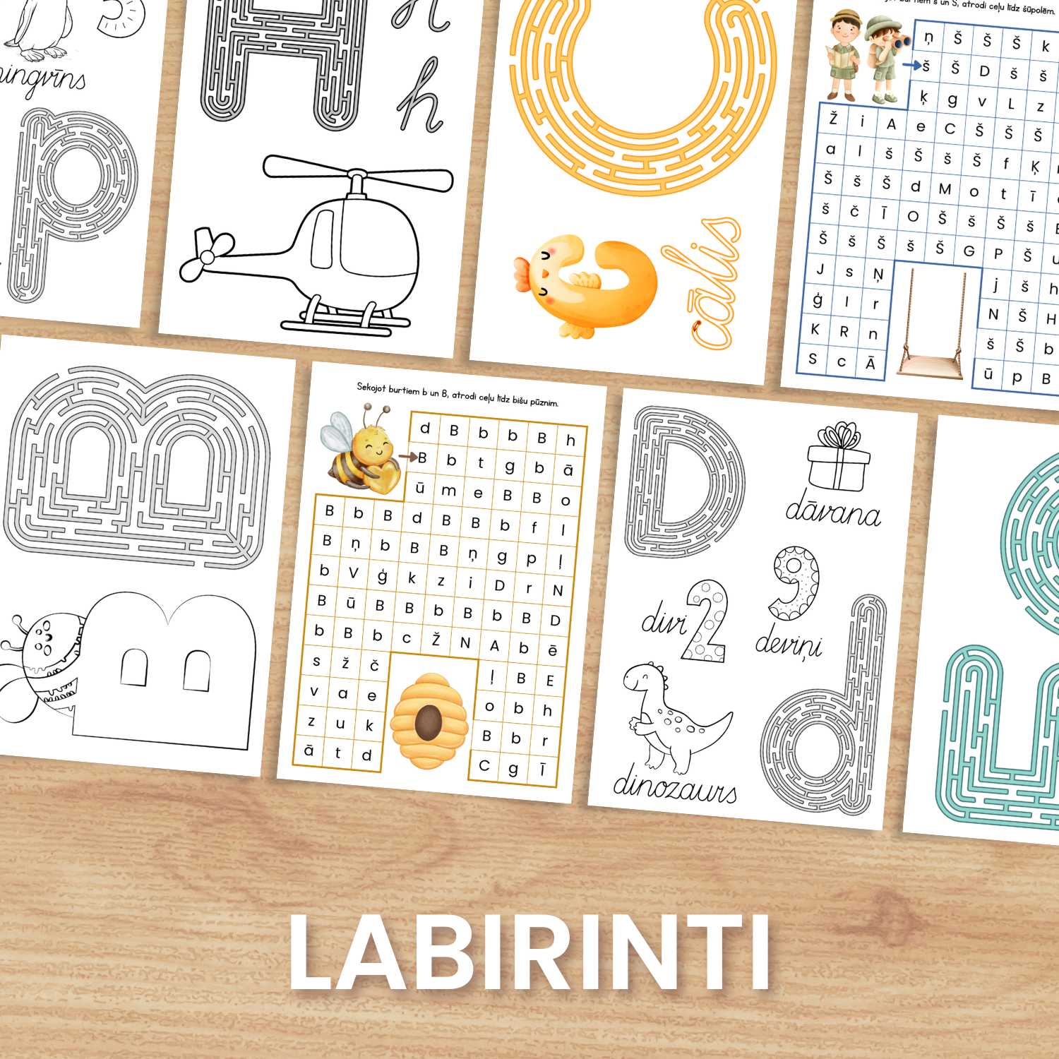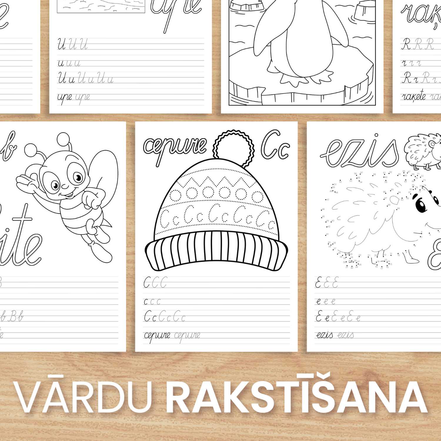 Darba lapas ar dažādiem uzdevumiem rakstīšanai, krāsošanai, burtu un attēlu puzlēm, kartītēm un citiem uzdevumiem.