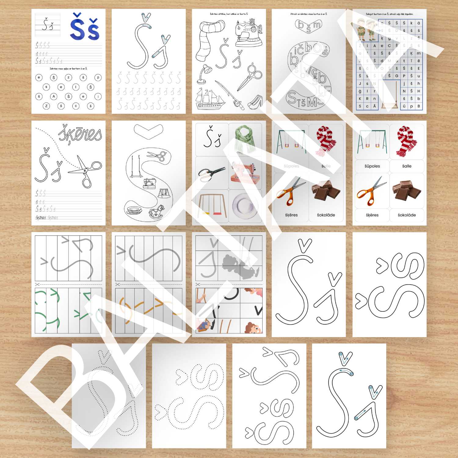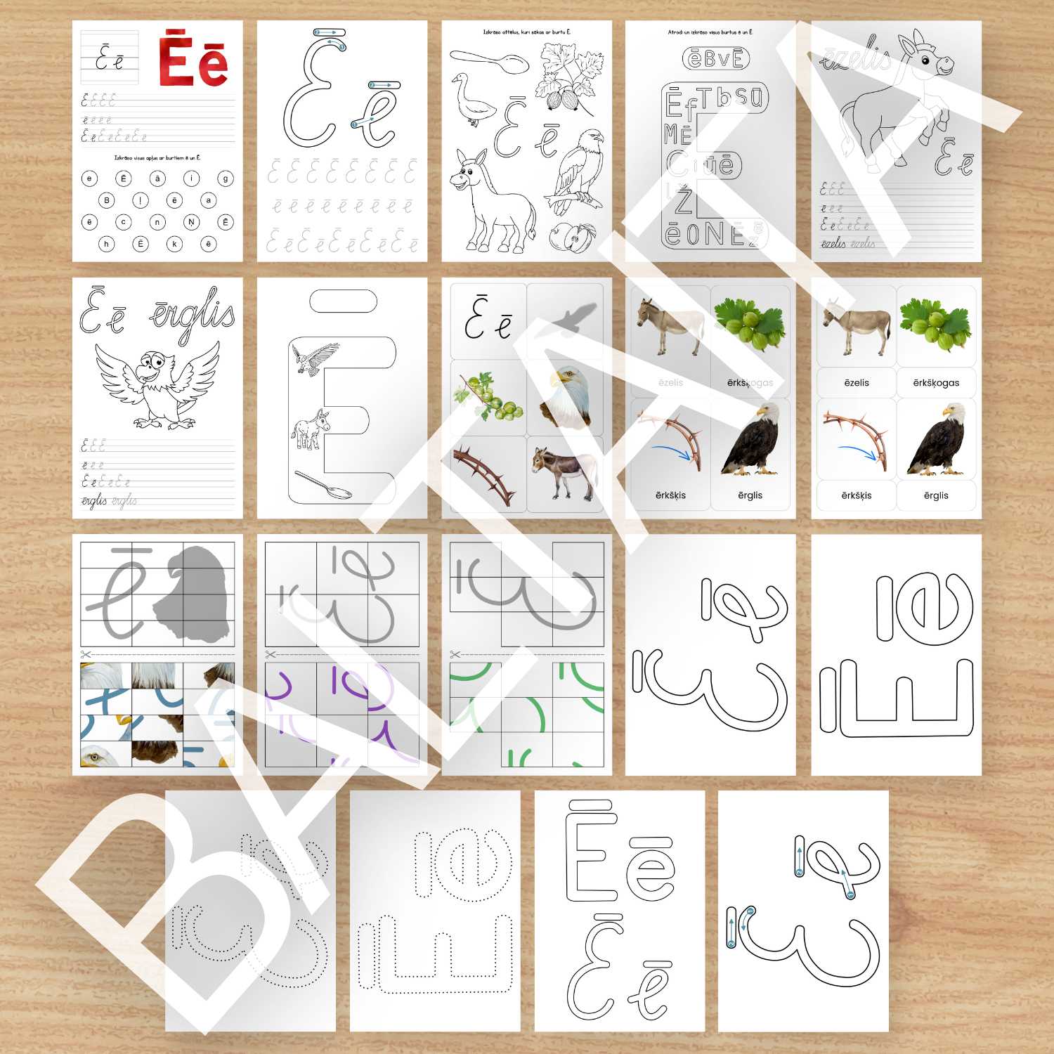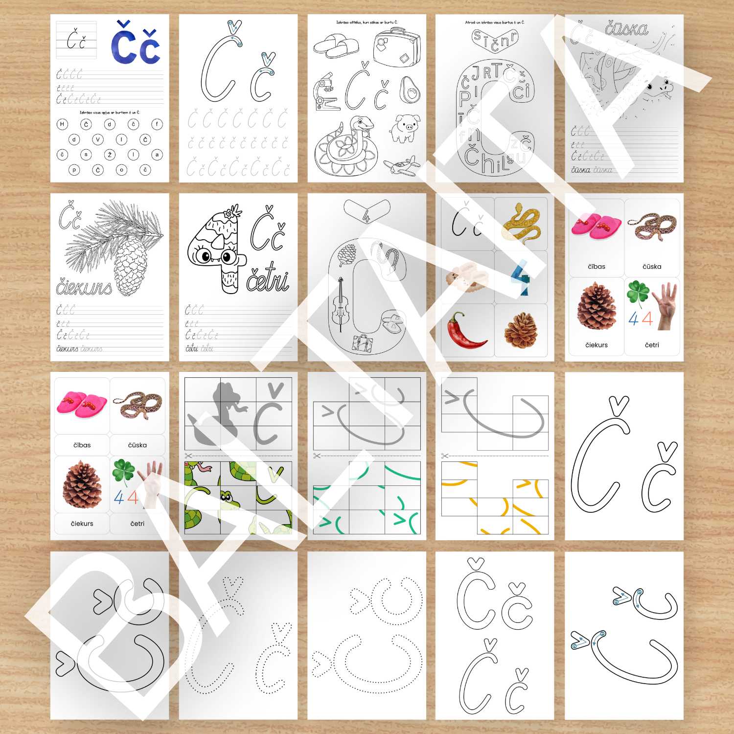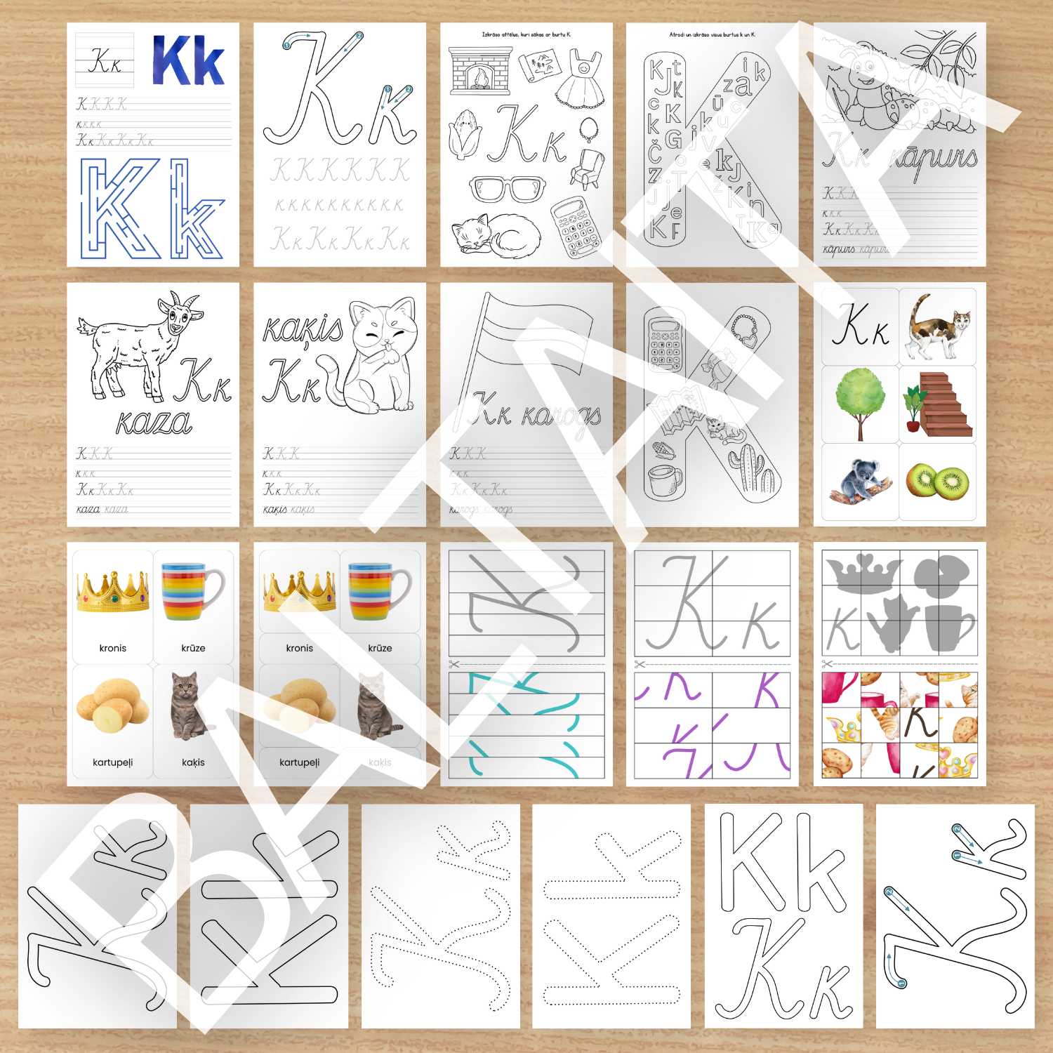 Darba lapas ar dažādiem uzdevumiem rakstīšanai, krāsošanai, burtu un attēlu puzlēm, kartītēm un citiem uzdevumiem.