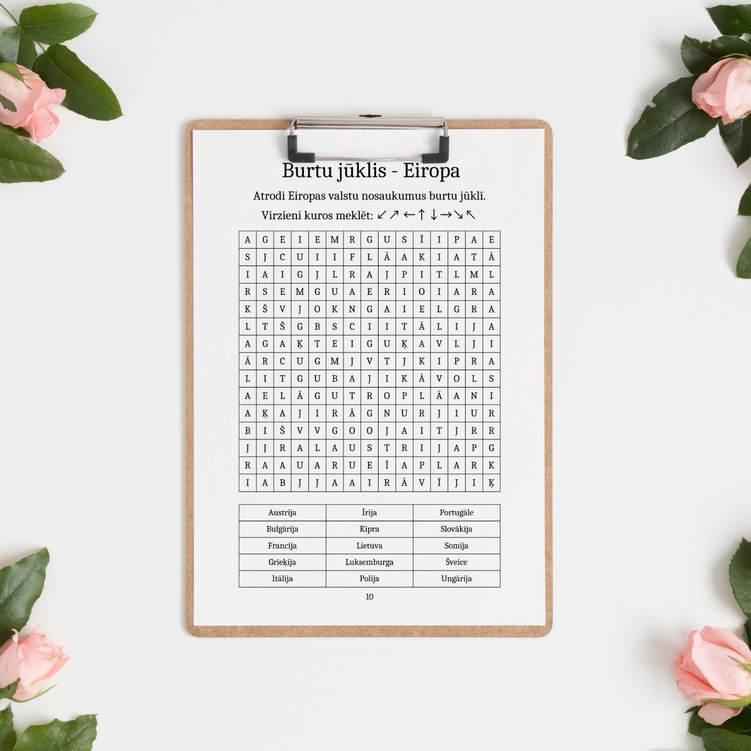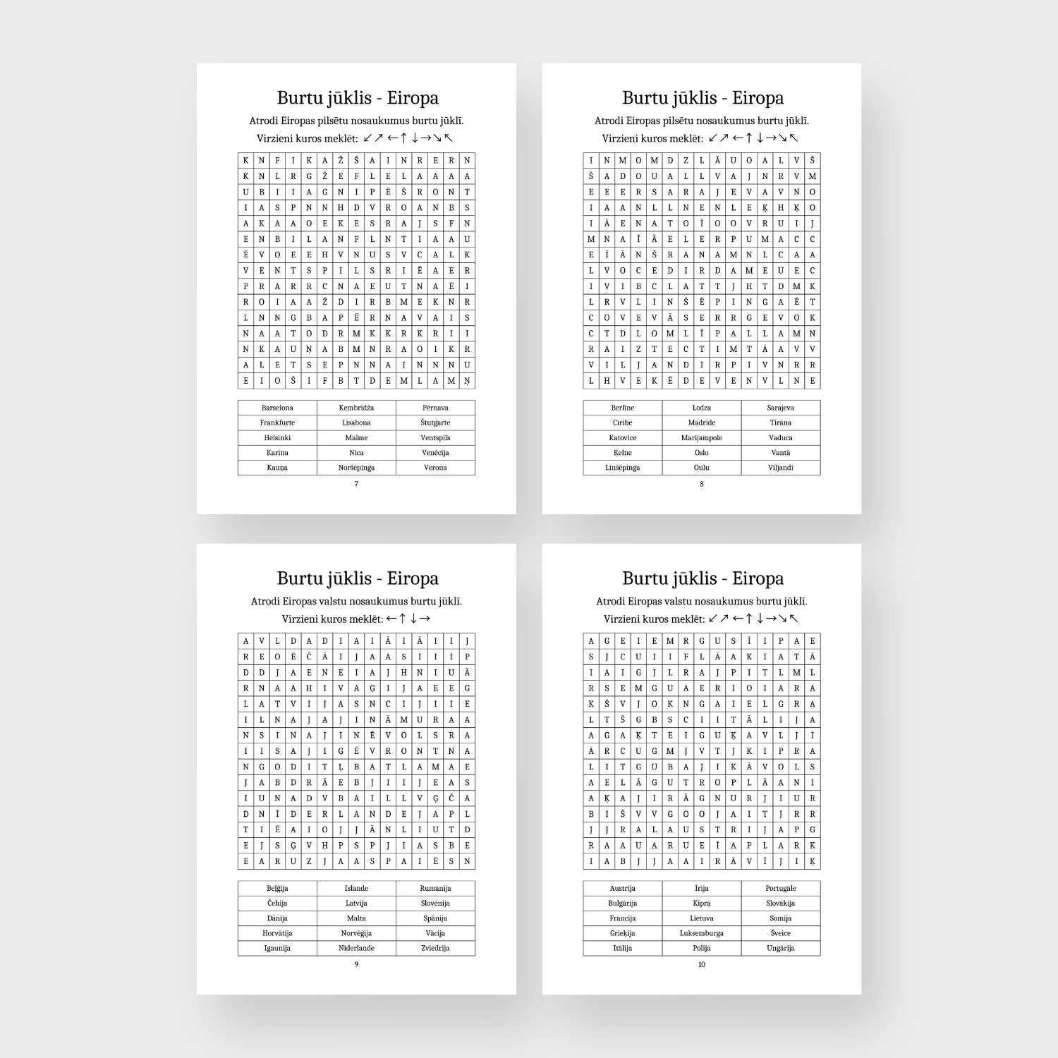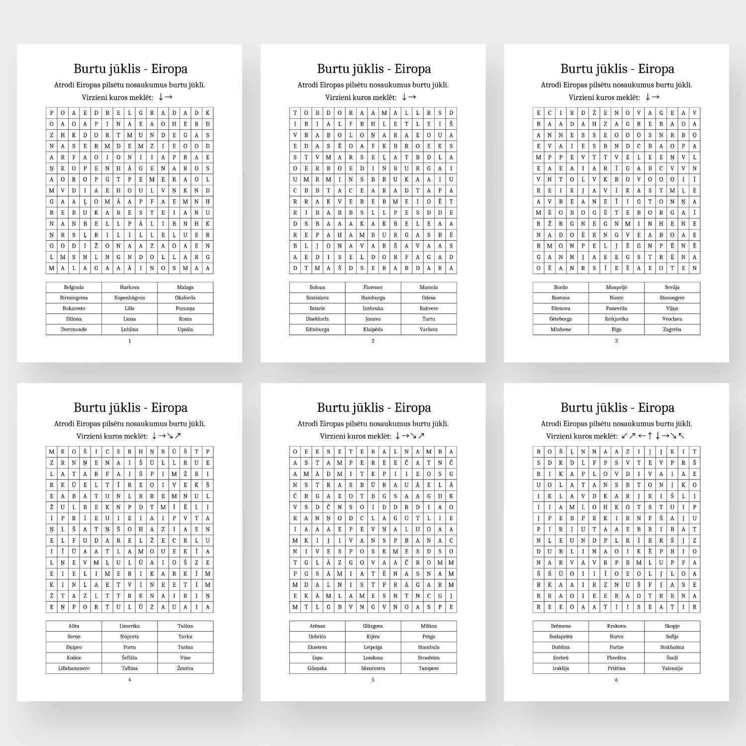 8 darba lapas ar Eiropas pilsētu nosaukumu meklēšanu un 2 lapas ar Eiropas valstīm.