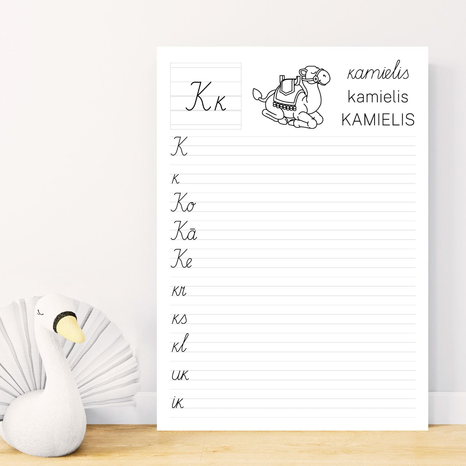 Lapas augšpusē attēloti rakstītie burti, attēls, kurš sākas ar doto burtu kā arī attēla nosaukums trīs dažādos fontos.