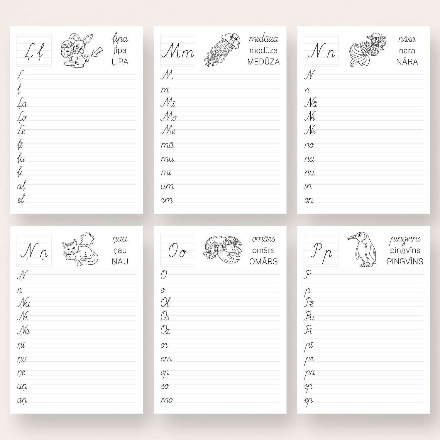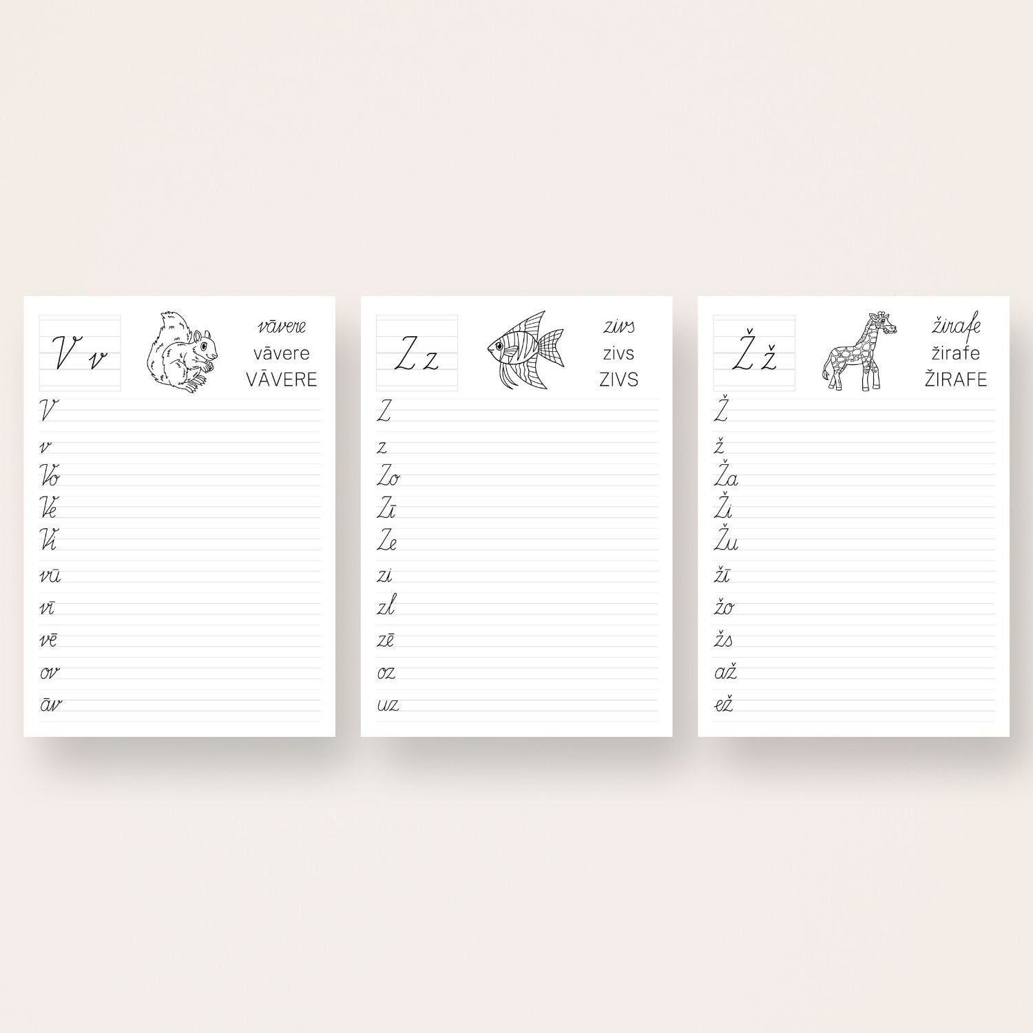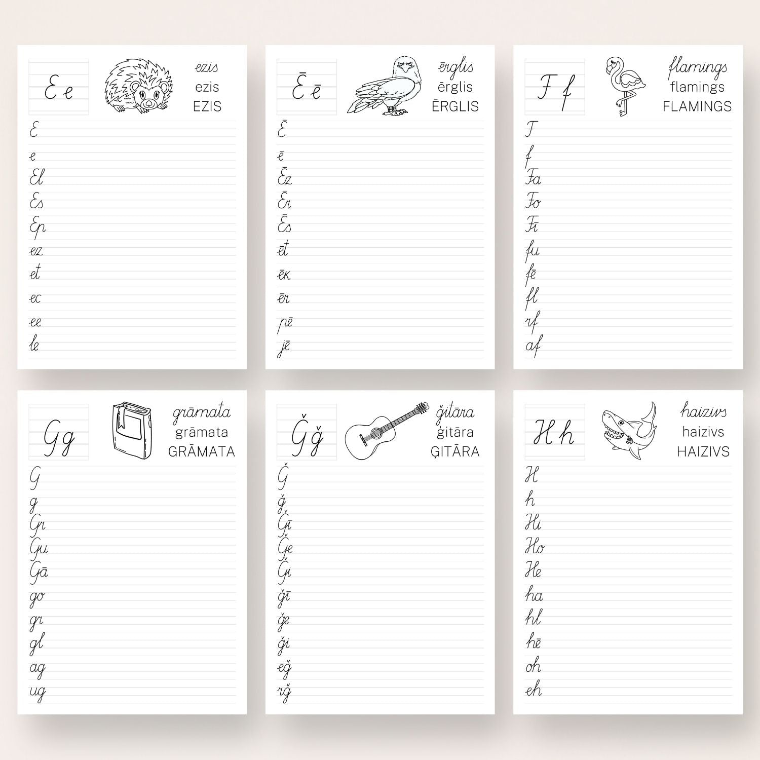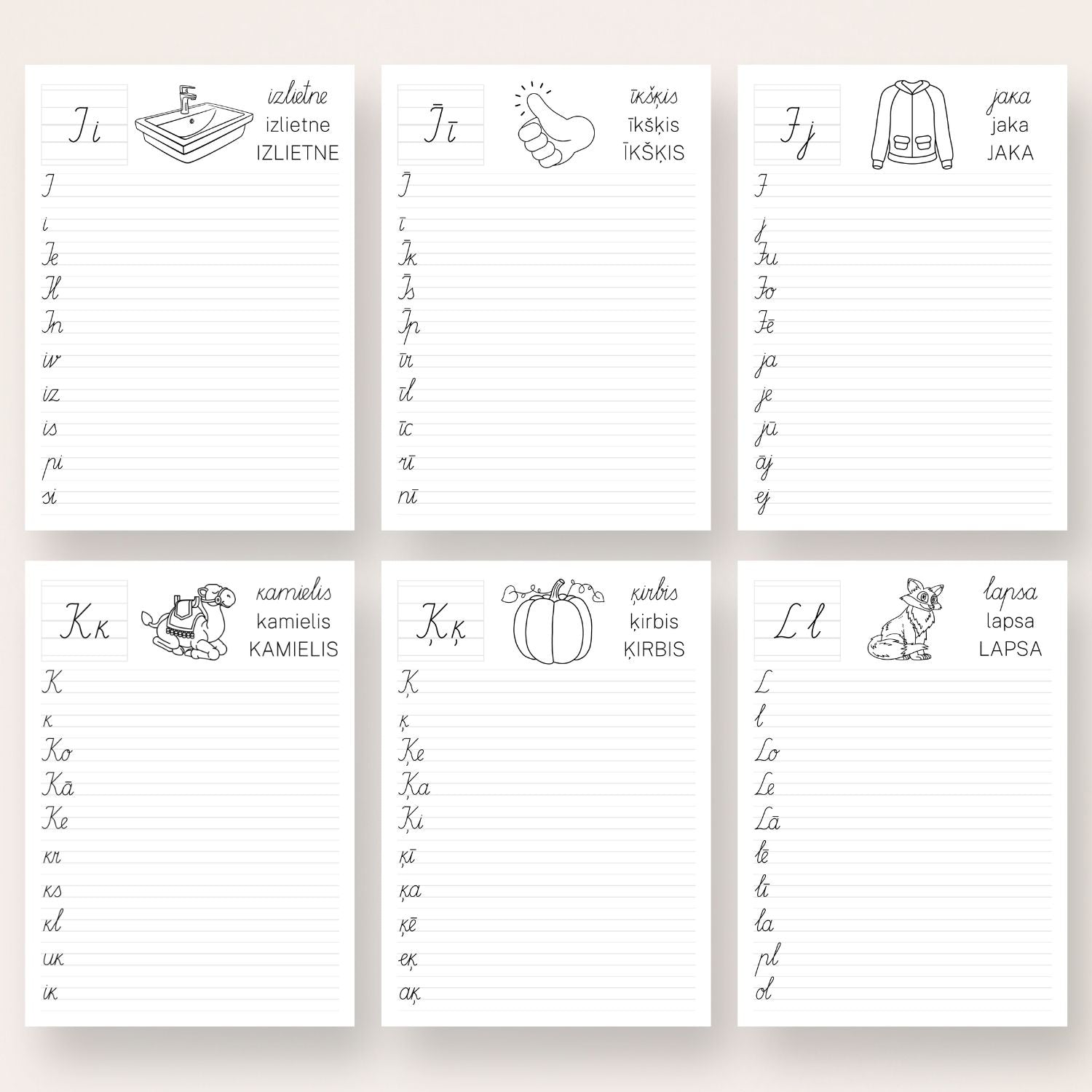 Katra darba lapa atveltīta katram no latviešu valodas alfabēta burtiem un tā iekļauj lielo un mazo burtu, kā arī burtu savienojumus kas sākas gan ar lielo, gan mazo burtu.