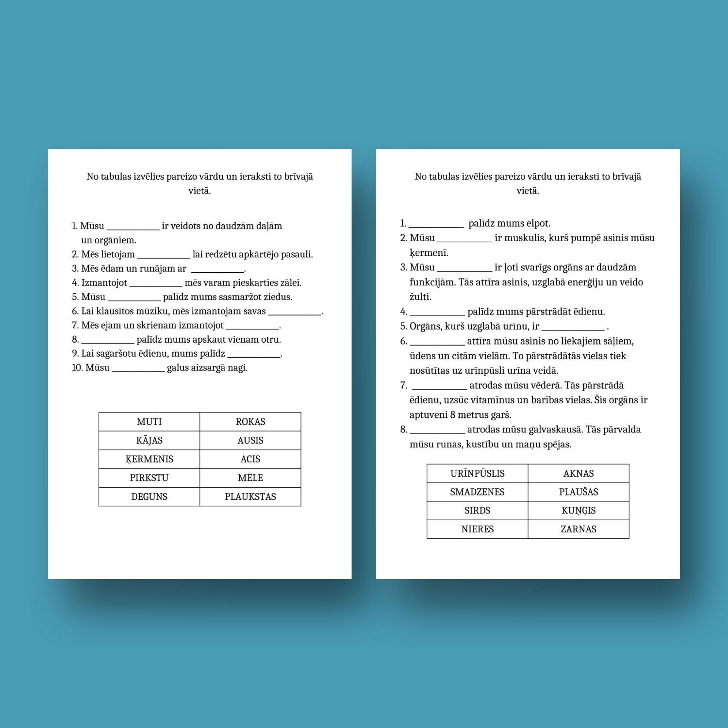Darba lapas par iekšējiem orgāniem un ķermeņa daļām.