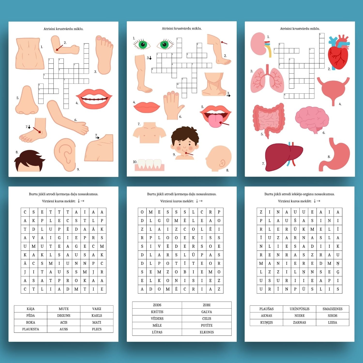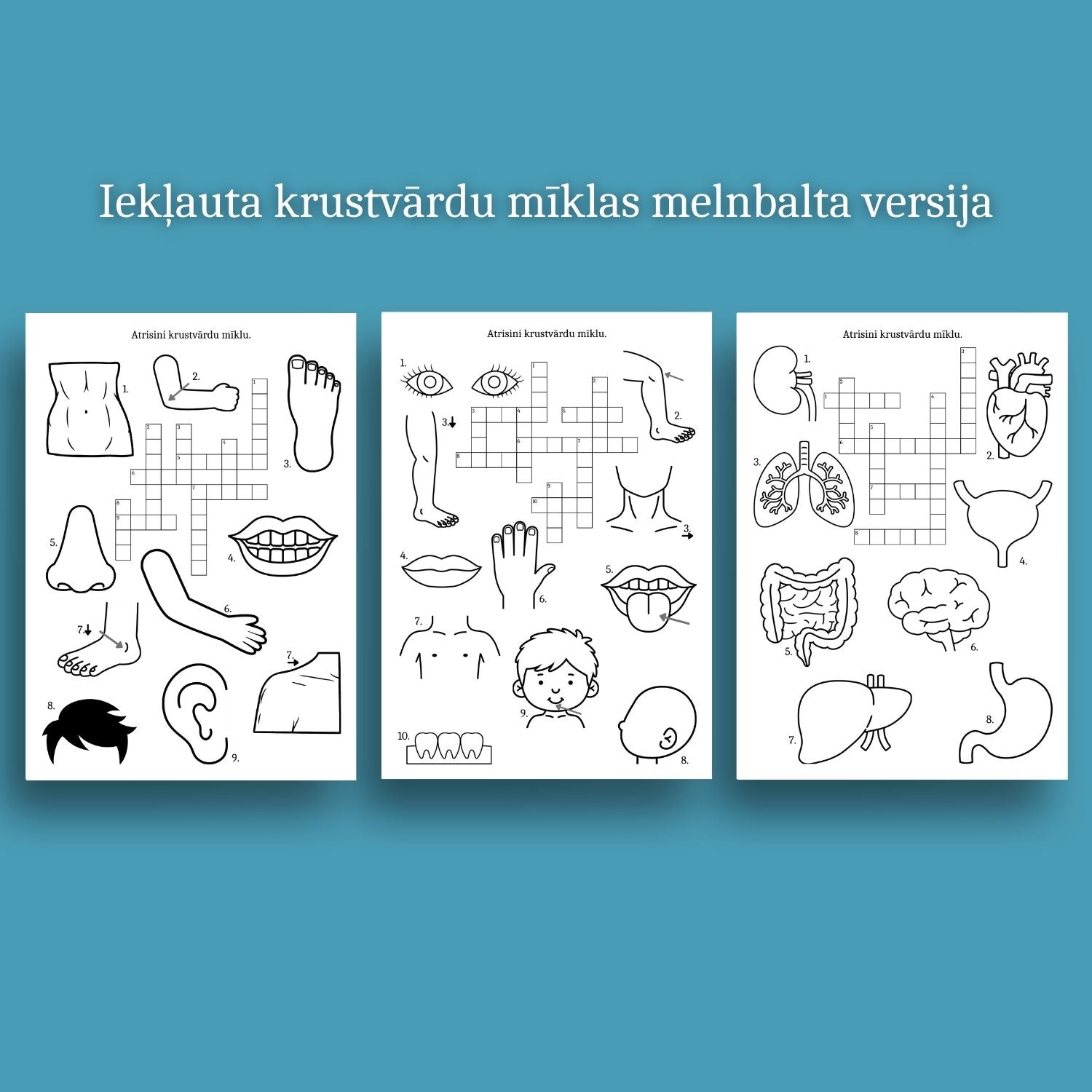 3 krustvārdu mīklas, divas no tām ar ķermeņa daļām un viena ar iekšējiem orgāniem. Krustvārdu mīklām iekļauta arī melnbalta versija.