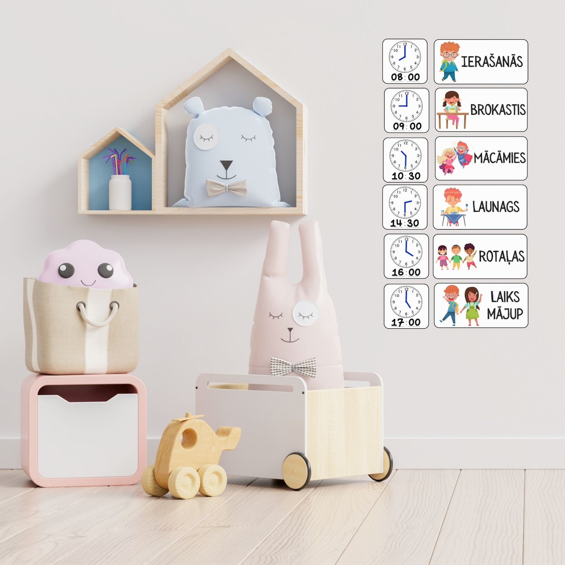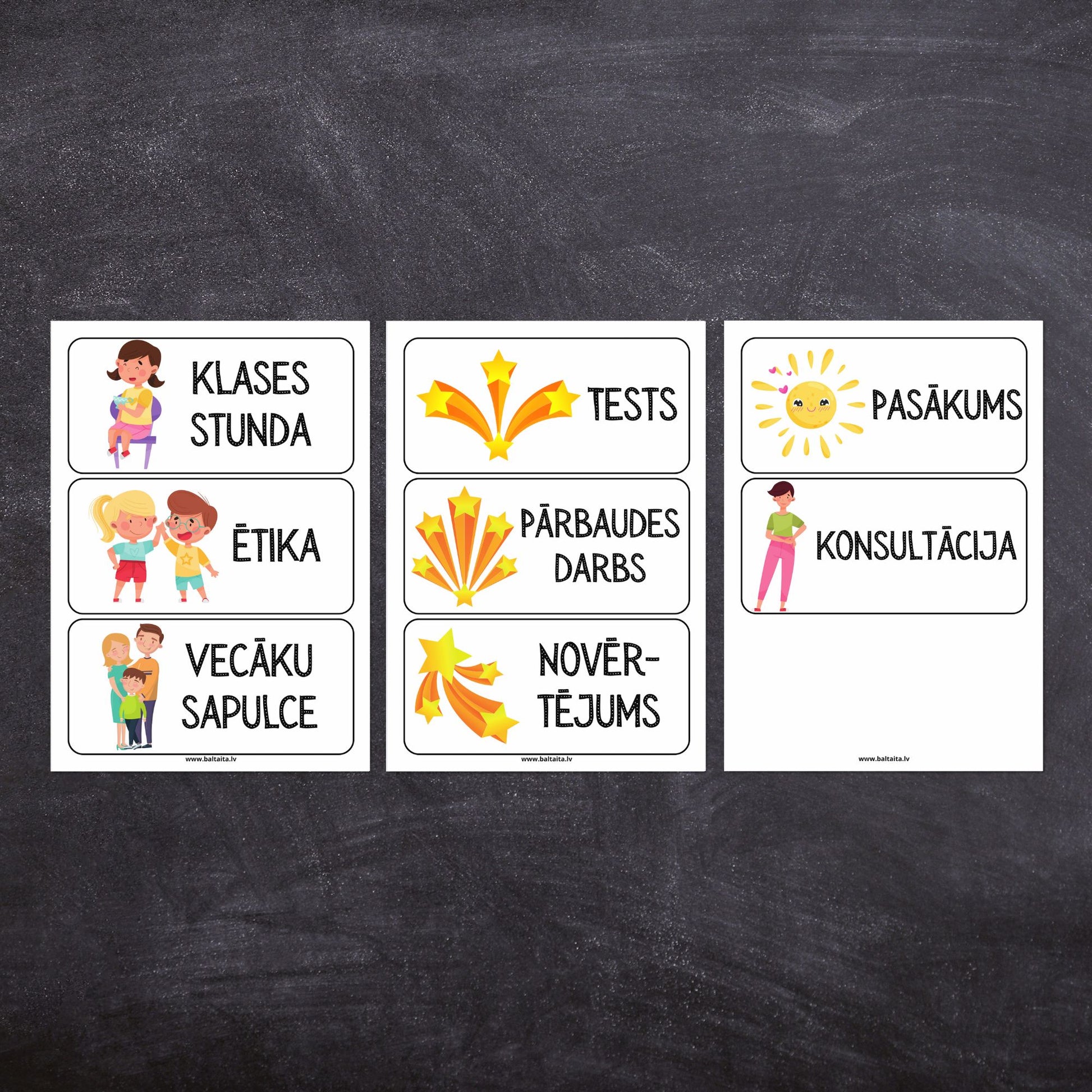 Šis dienas režīma materiāls ietver nodarbību un dienas ritma nosaukumus pirmsskolai un mācību stundu nosaukumus sākumskolai.