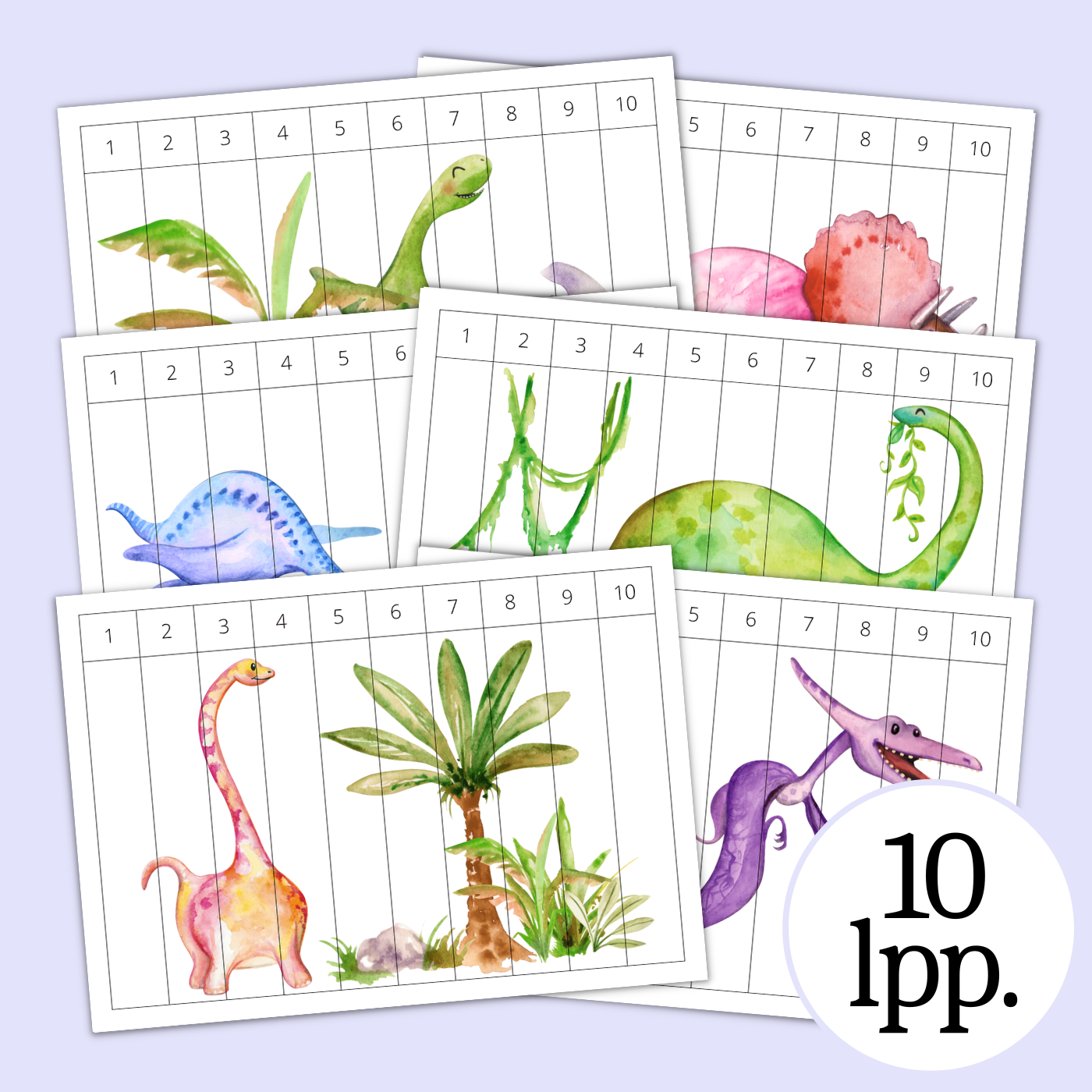 Iekļautas 10 dažādas puzles ar dinozauru attēliem un katrs attēls griežams 10 gabaliņos.
