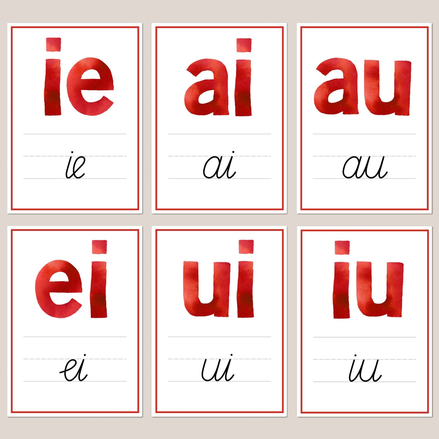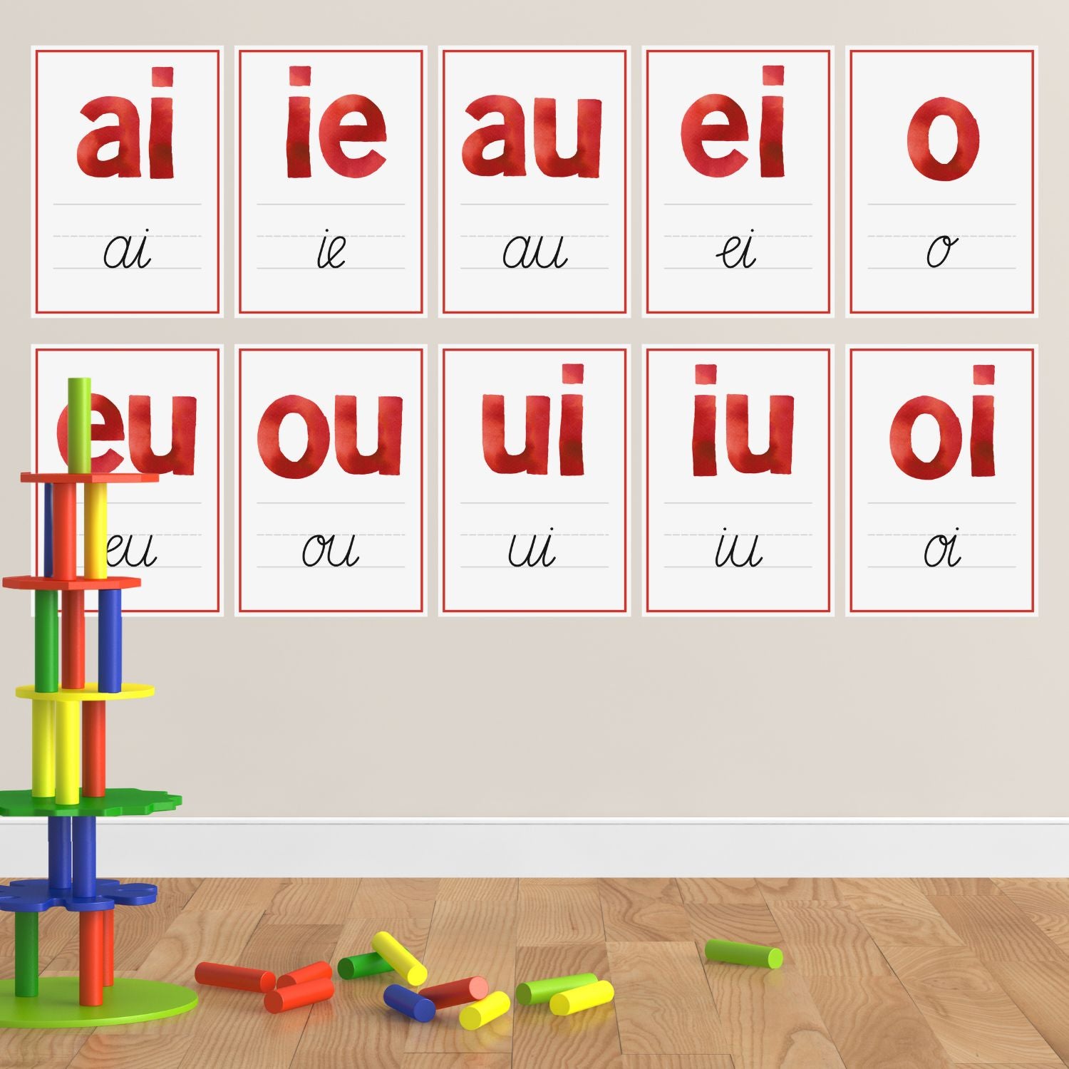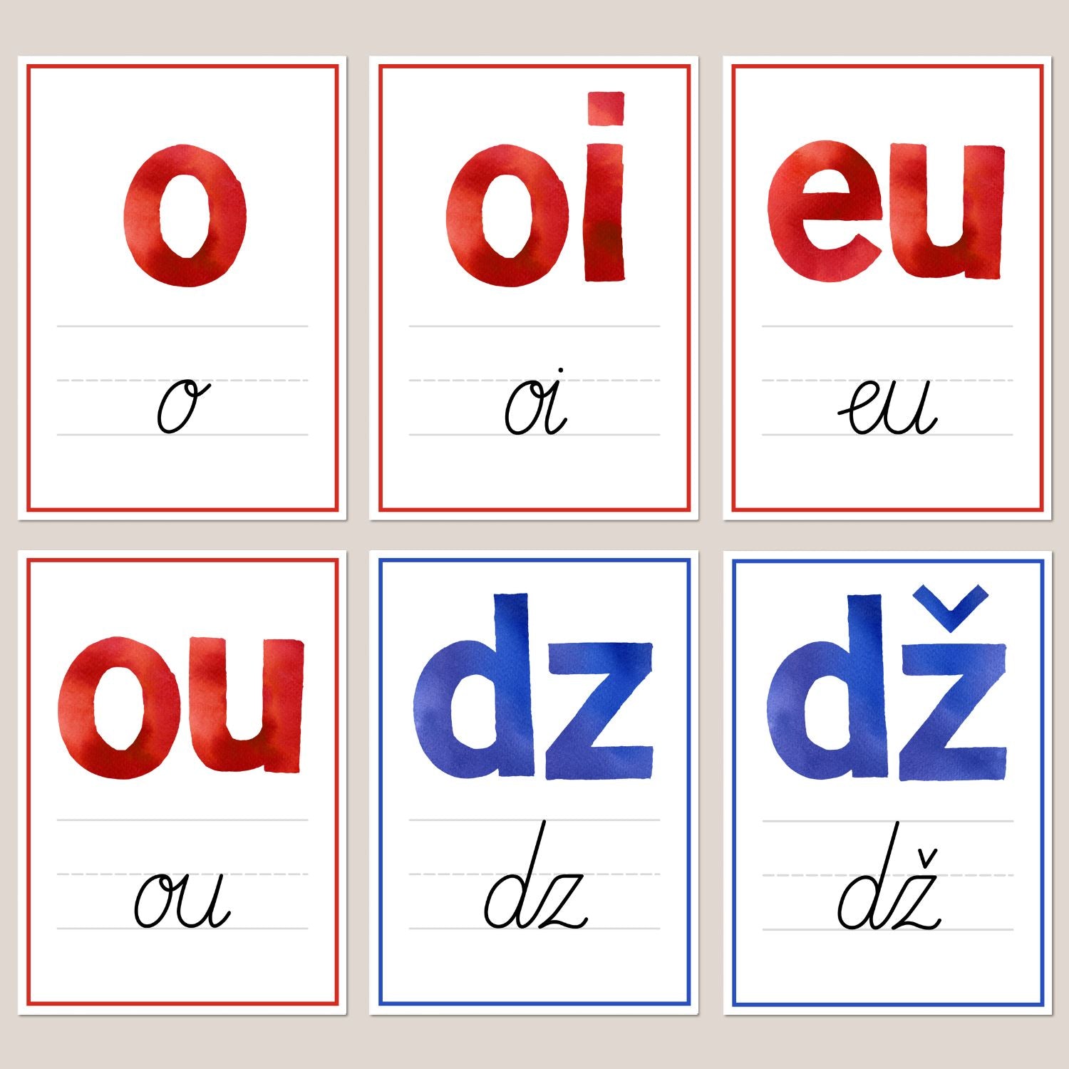 Divskaņu plakātu komplekts kas iekļauj visus desmit latviešu valodas divskaņus kā arī skaņas “dz” un “dž”.