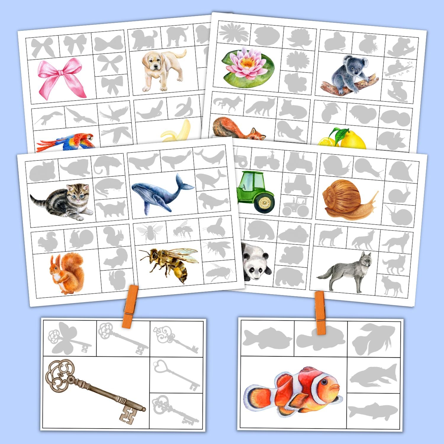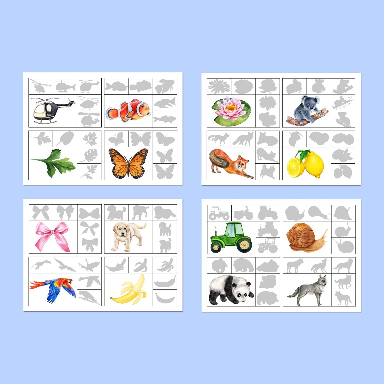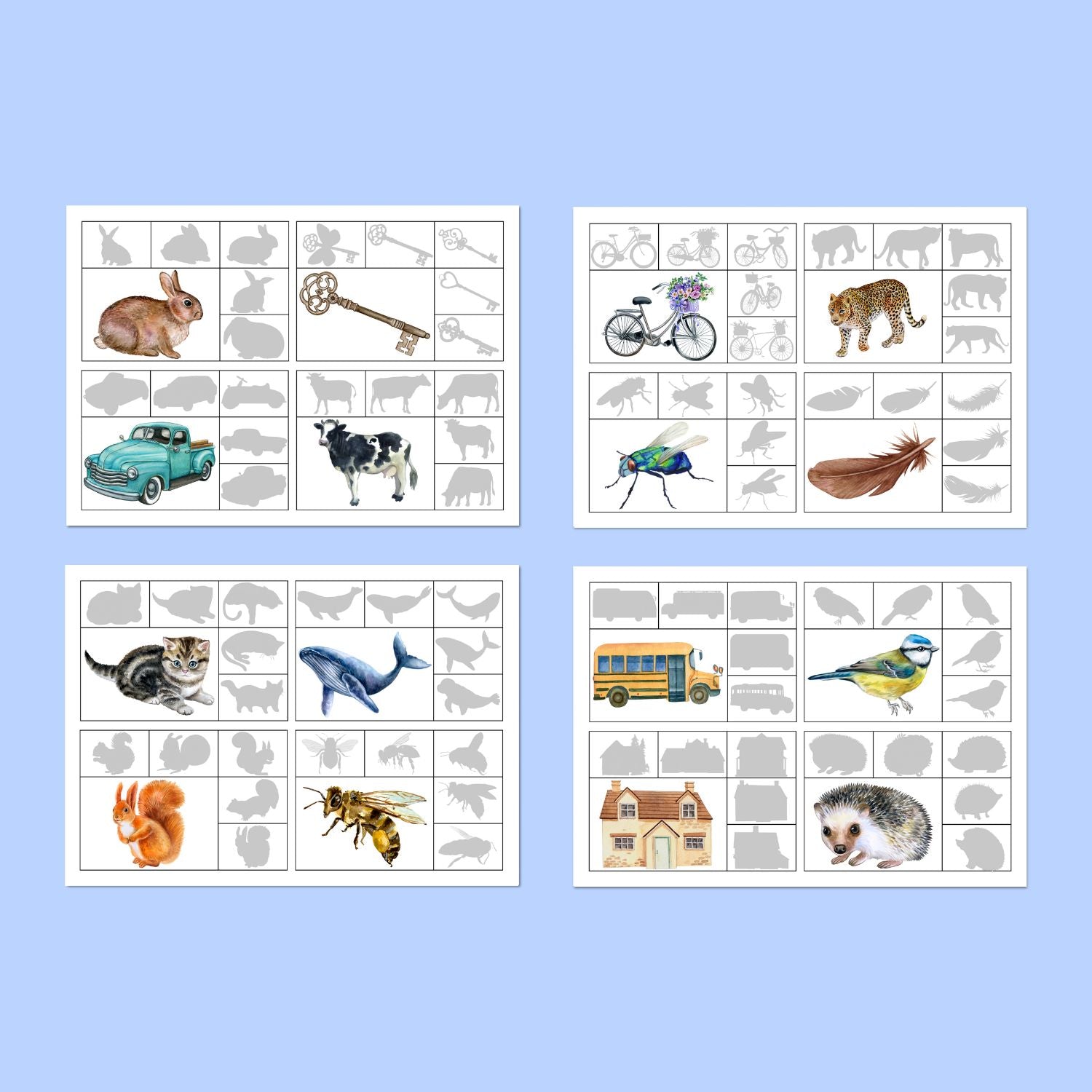 Šo mācību materiālu var izmantot arī citos veidos, piemēram mācot attēlā redzamos dzīvnieku un priekšmetu nosaukumus.
