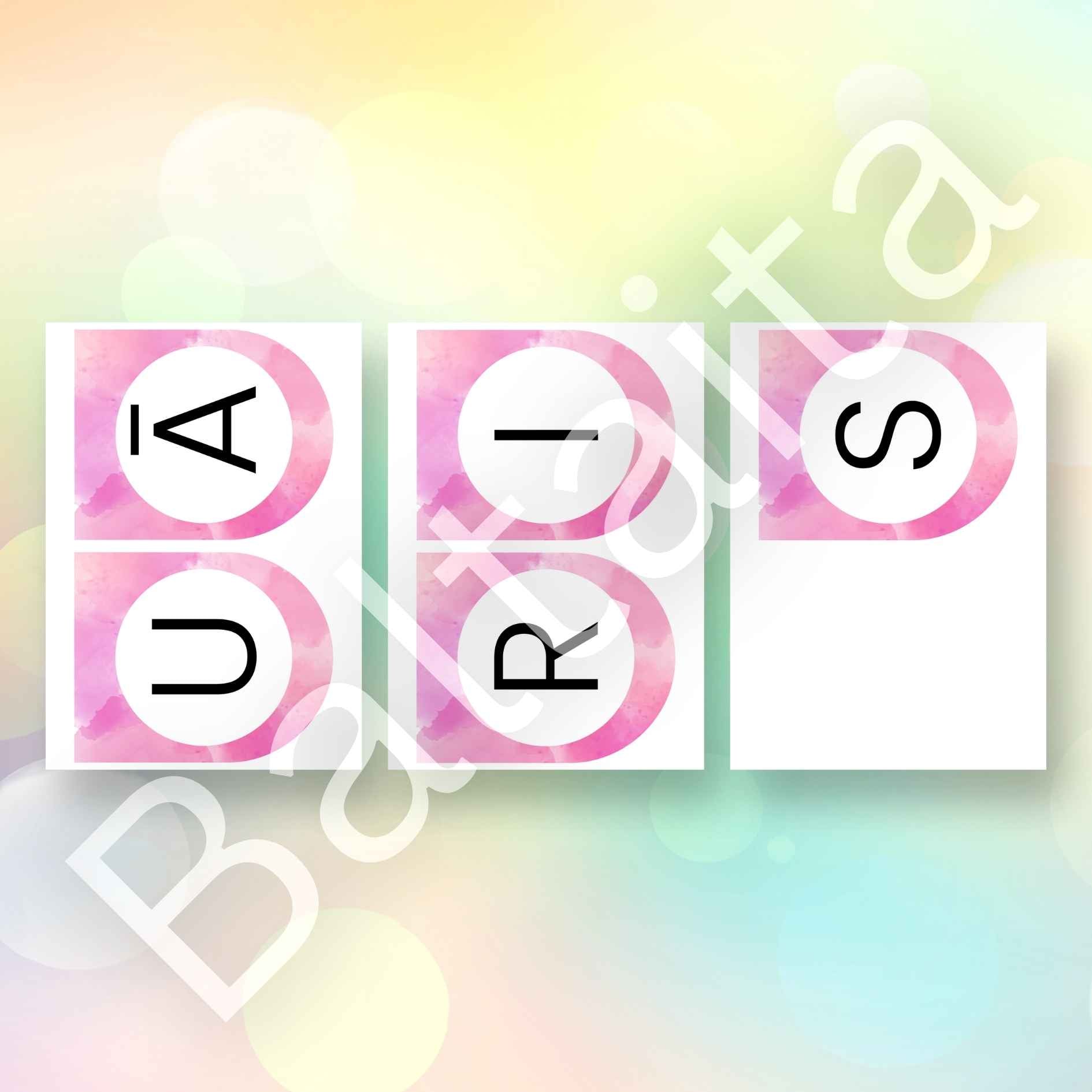 Uz katras lapas ir divi burtiņi, un drukājot uz A4 viss uzraksts būs aptuveni 125 cm platumā.