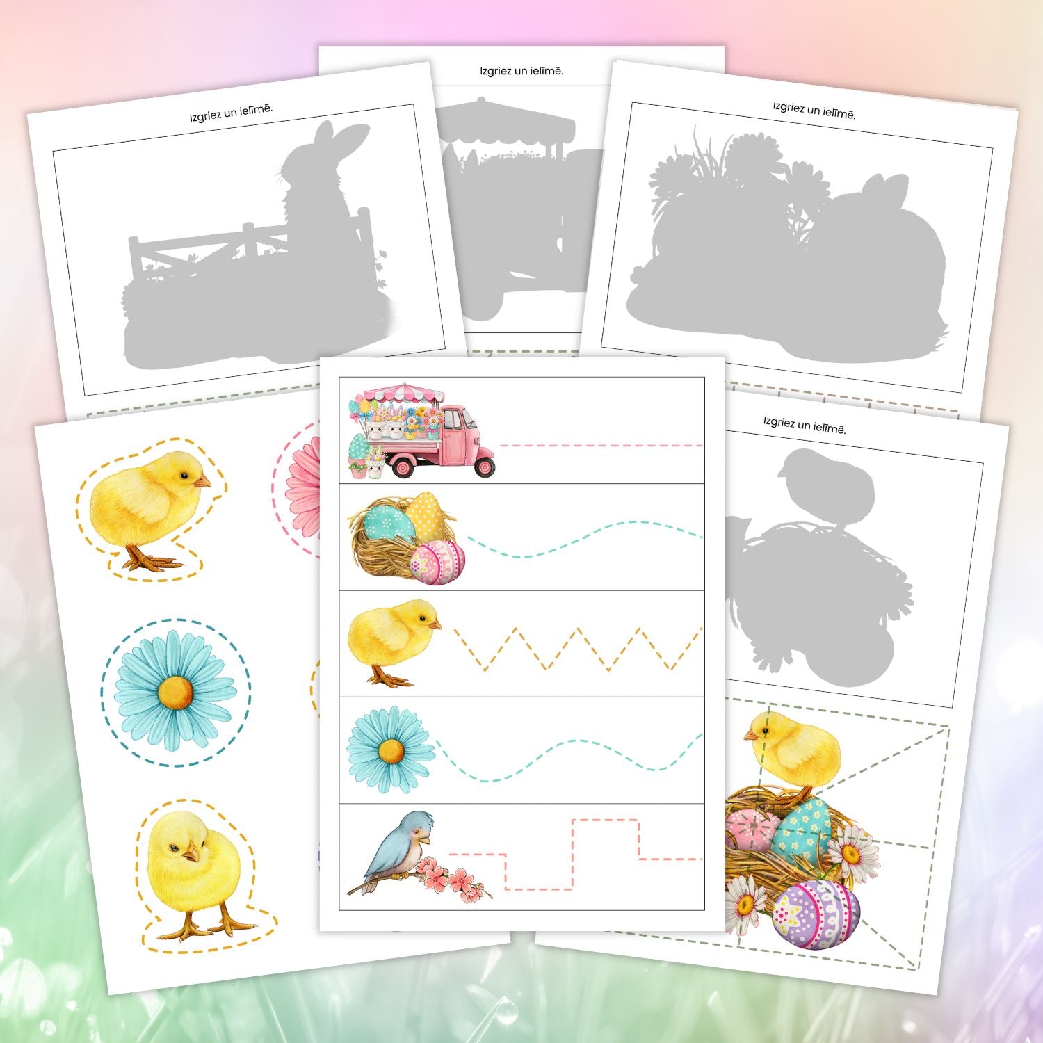 Darba lapas griešanas prasmju uzlabošanai pavasara un Lieldienu tematikā kuras var izmantot arī vilkšanai ar rakstāmpiederumu.