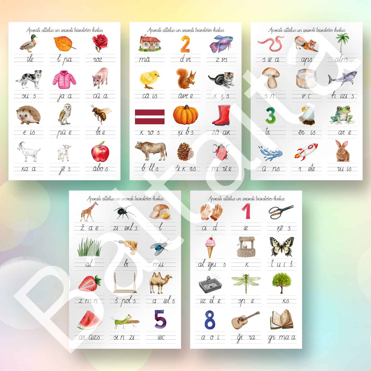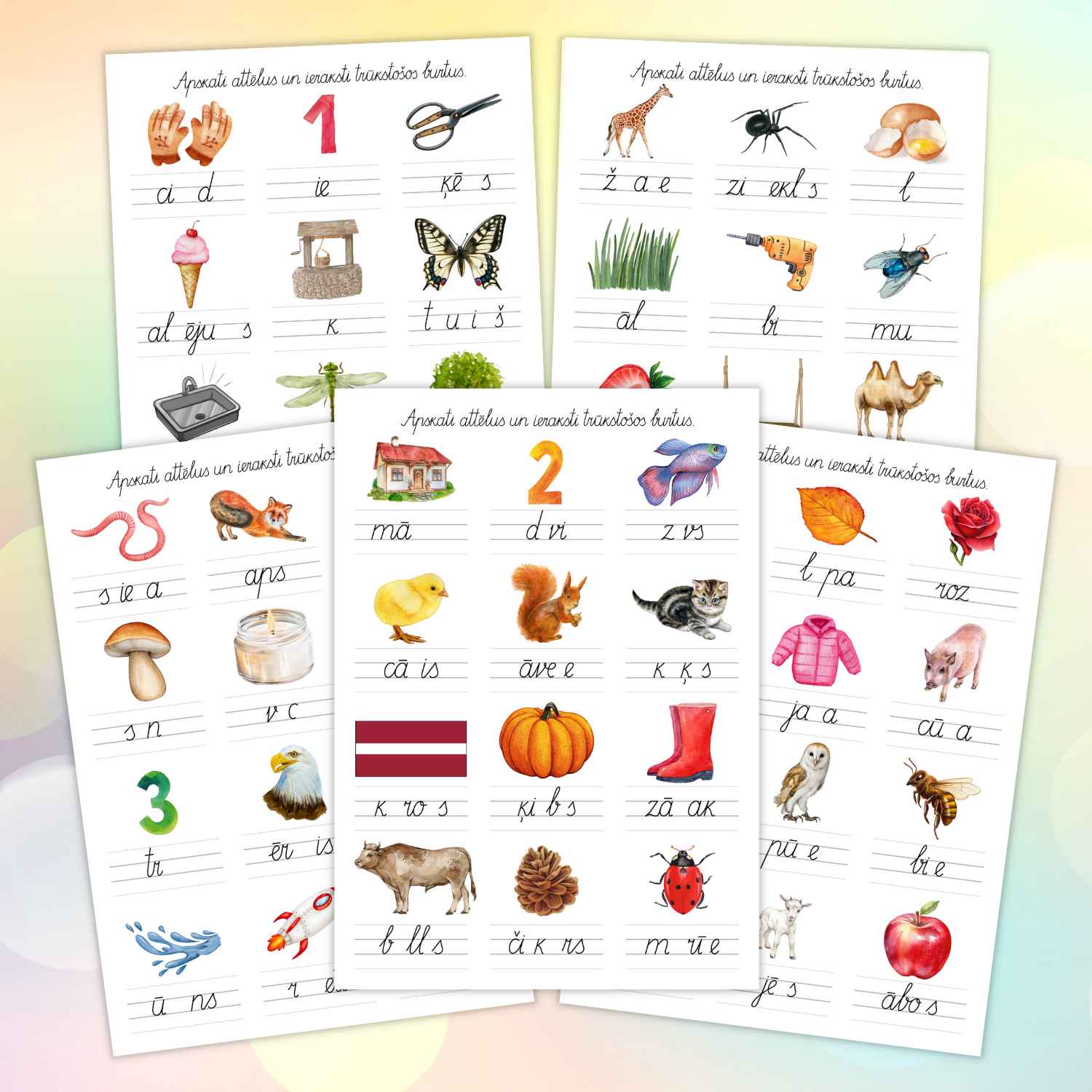 Piecas darba lapas ar krāsainiem attēliem un 60 dažādiem uzdevumiem trūkstošo burtu ierakstīšanai.