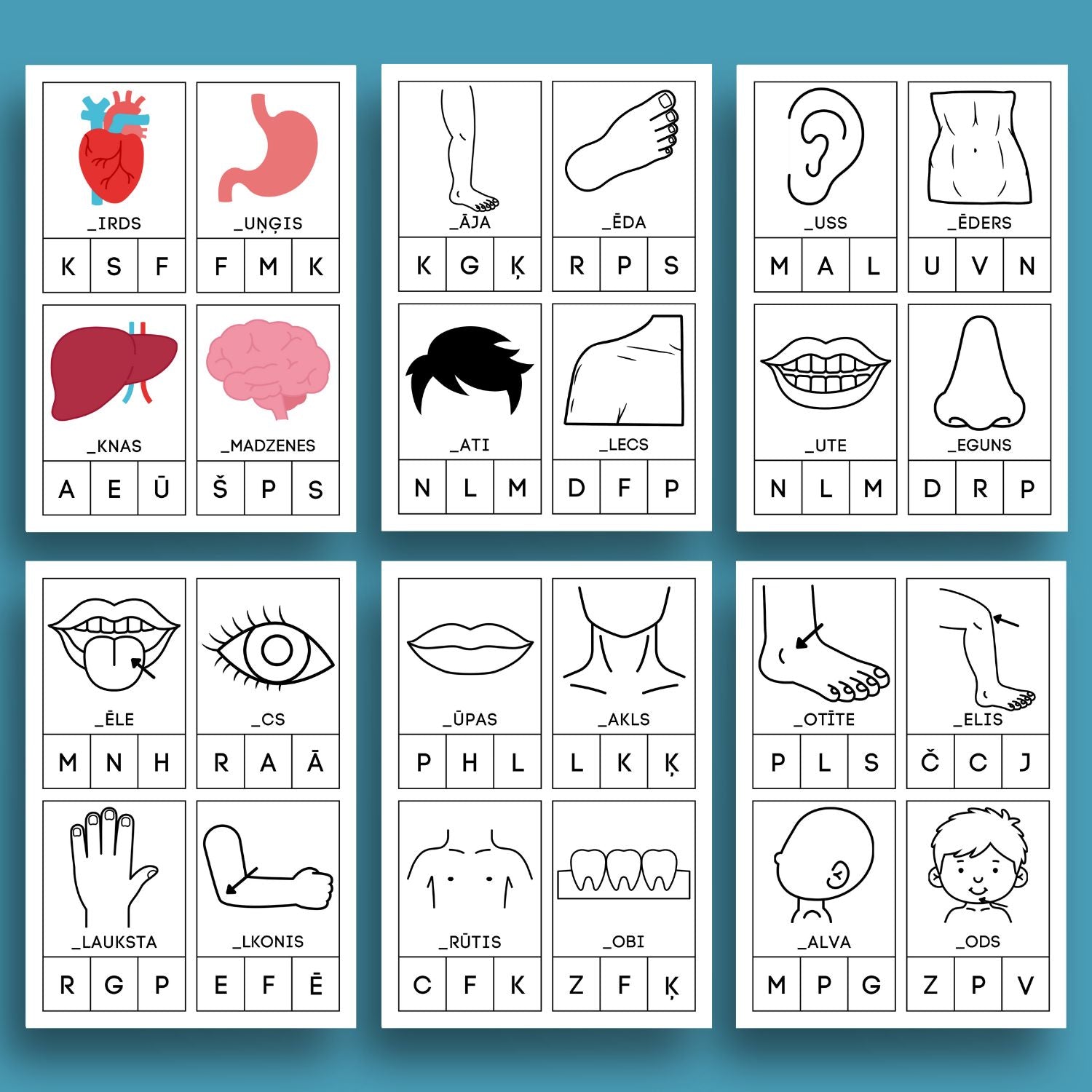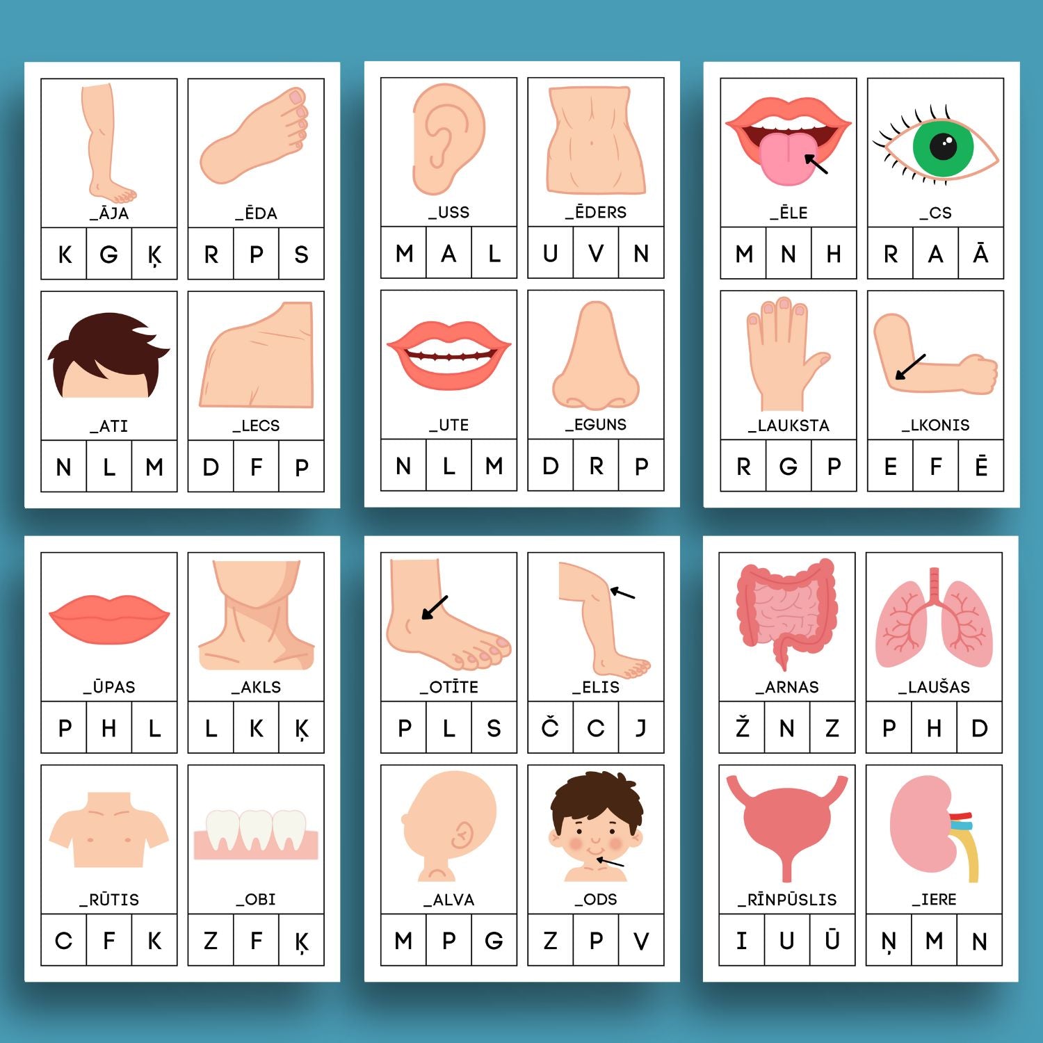 28 dažādas rādāmās knaģu kartītes ar ķermeņa daļām un iekšējiem orgāniem.