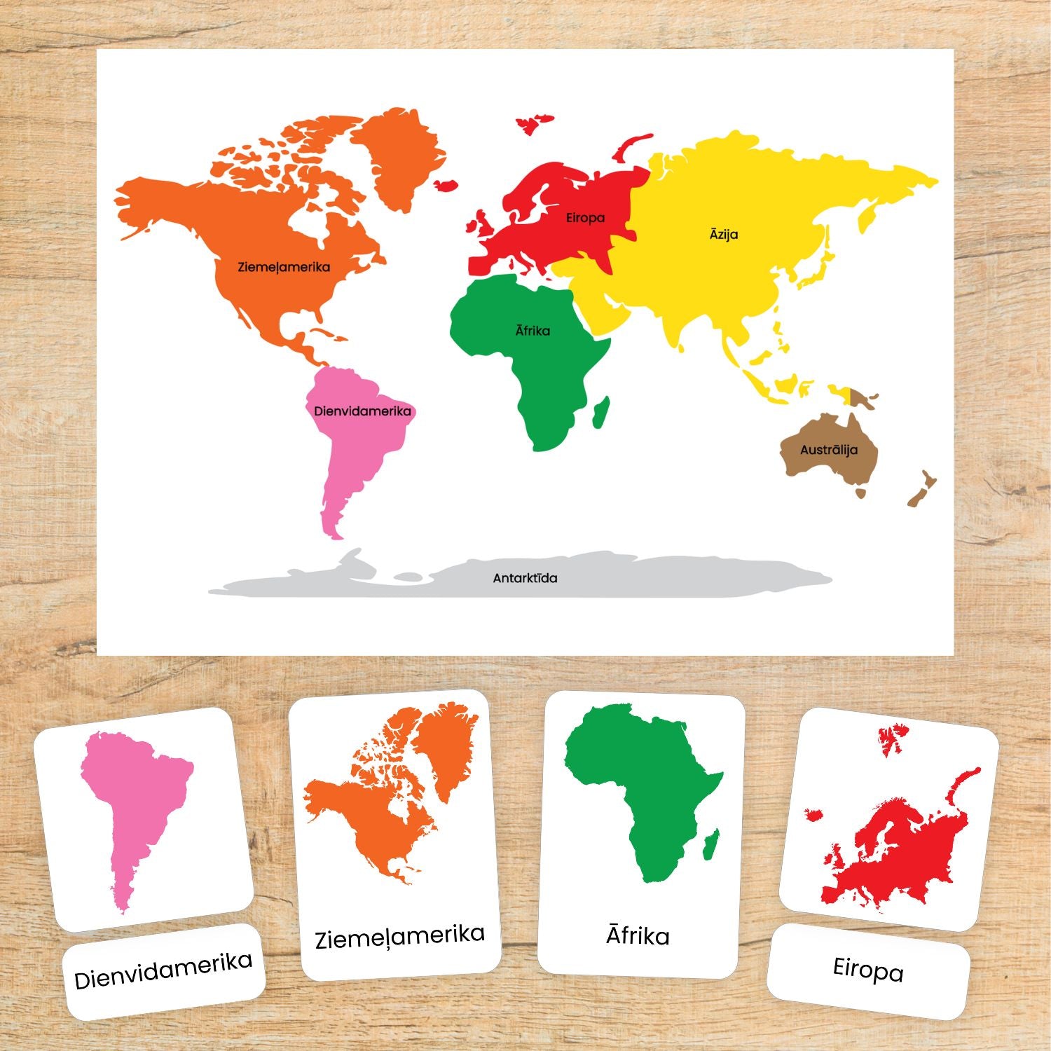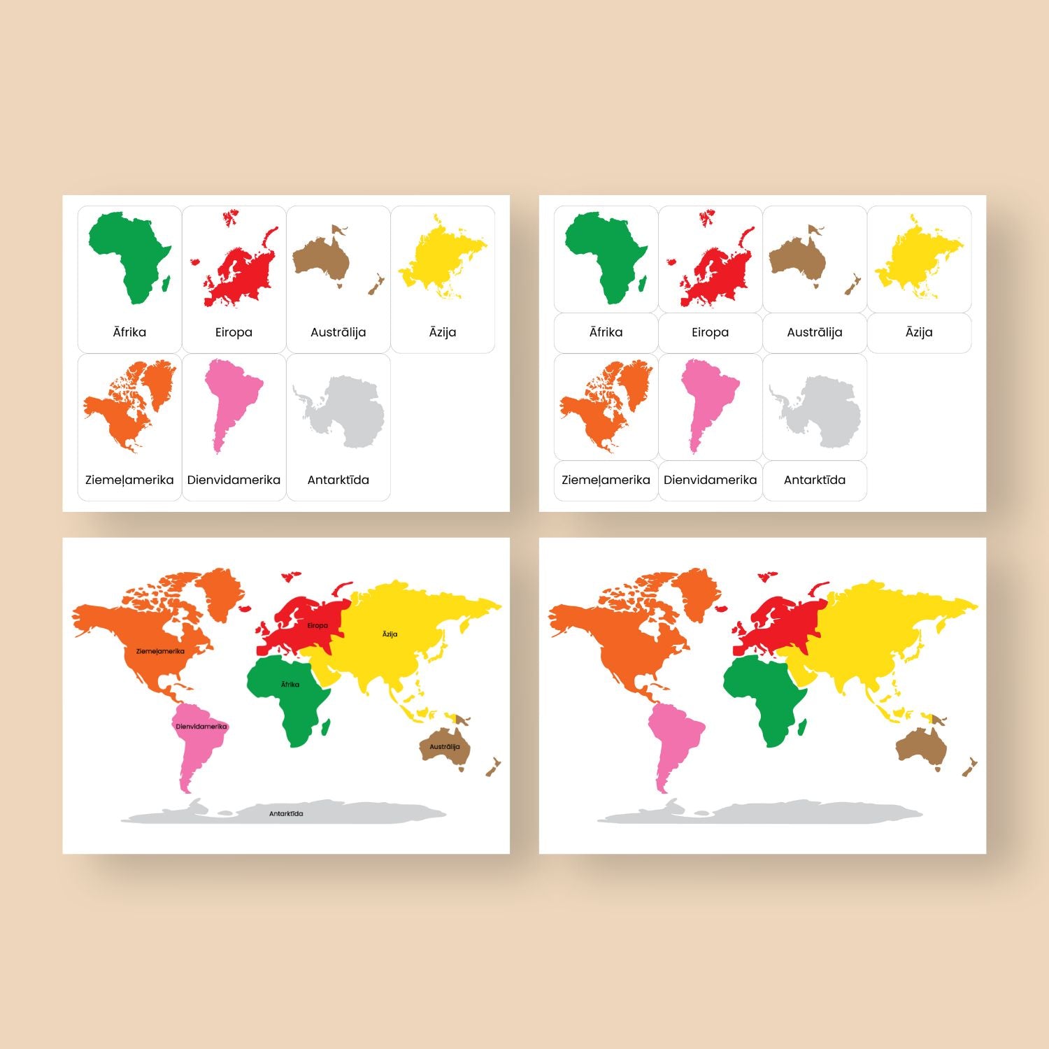 Katra kartīte satur vienu no kontinentiem un pieejama gan viendaļīga – kopā ar nosaukumu, gan ar attēlu un nosaukumu atsevišķi.