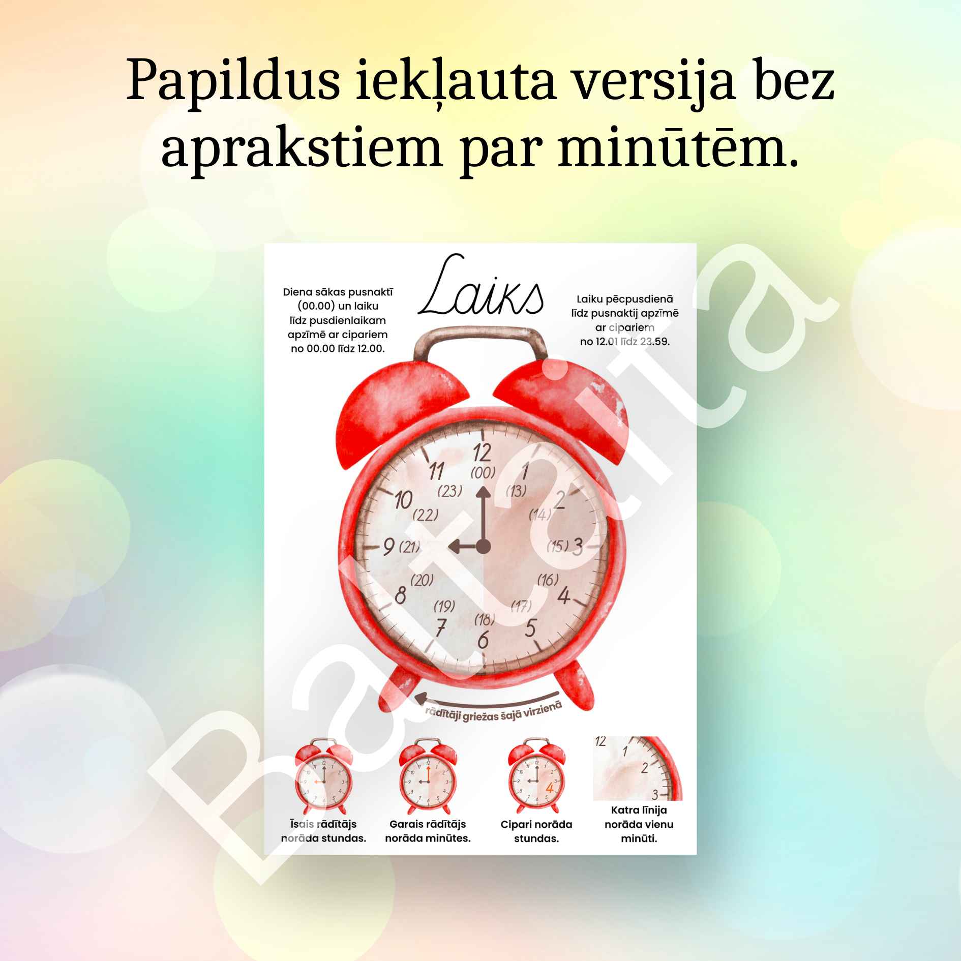 Papildus iekļauta atgādne ar dažādiem laika mēriem, piemēram “1 minūte = 60 sekundes”. Atgādne veidota ar latviešu valodas rakstītajiem burtiem.