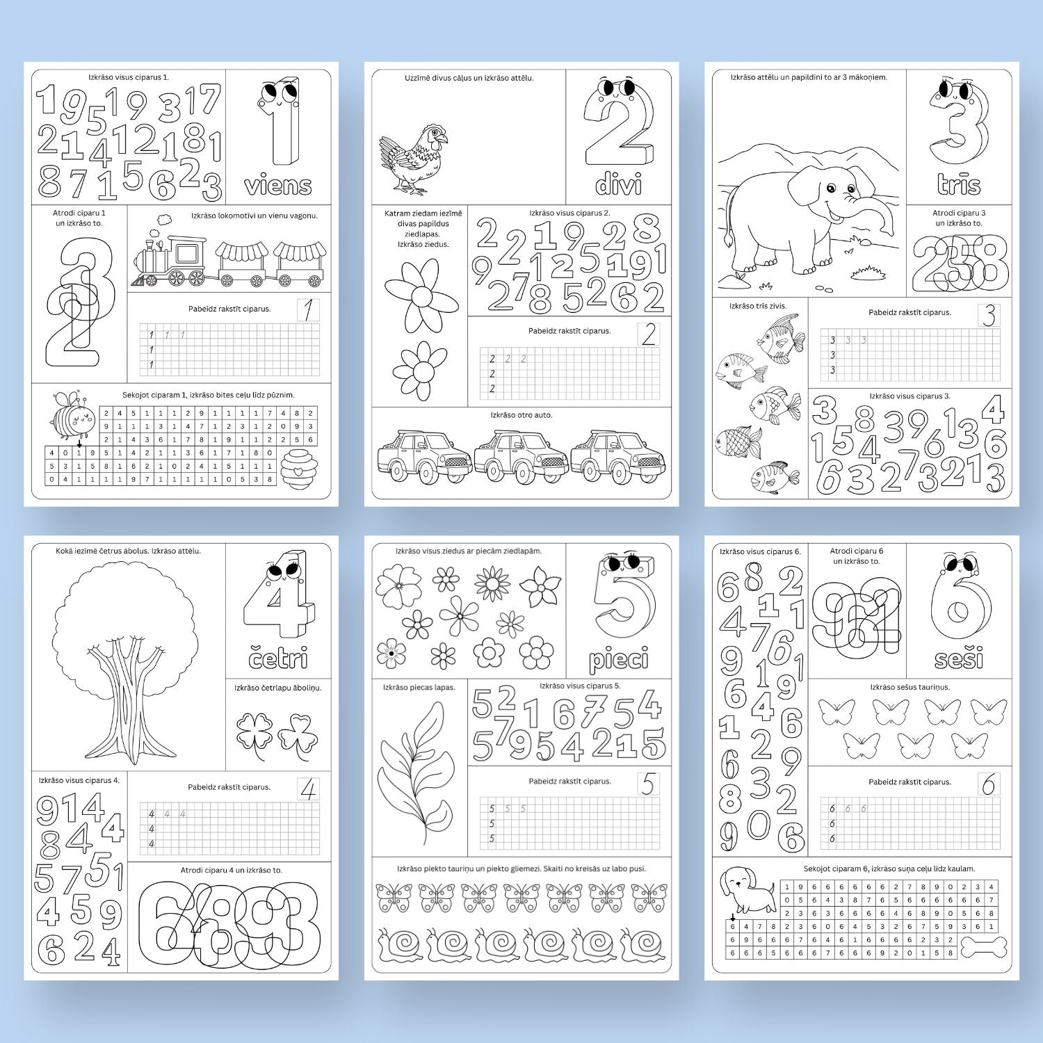 Šis mācību materiāls būs lielisks palīgs ciparu apguvē un palīdzēs gan mācīt, gan mācīties skaitīšanu, krāsošanu un ciparu vilkšanu.