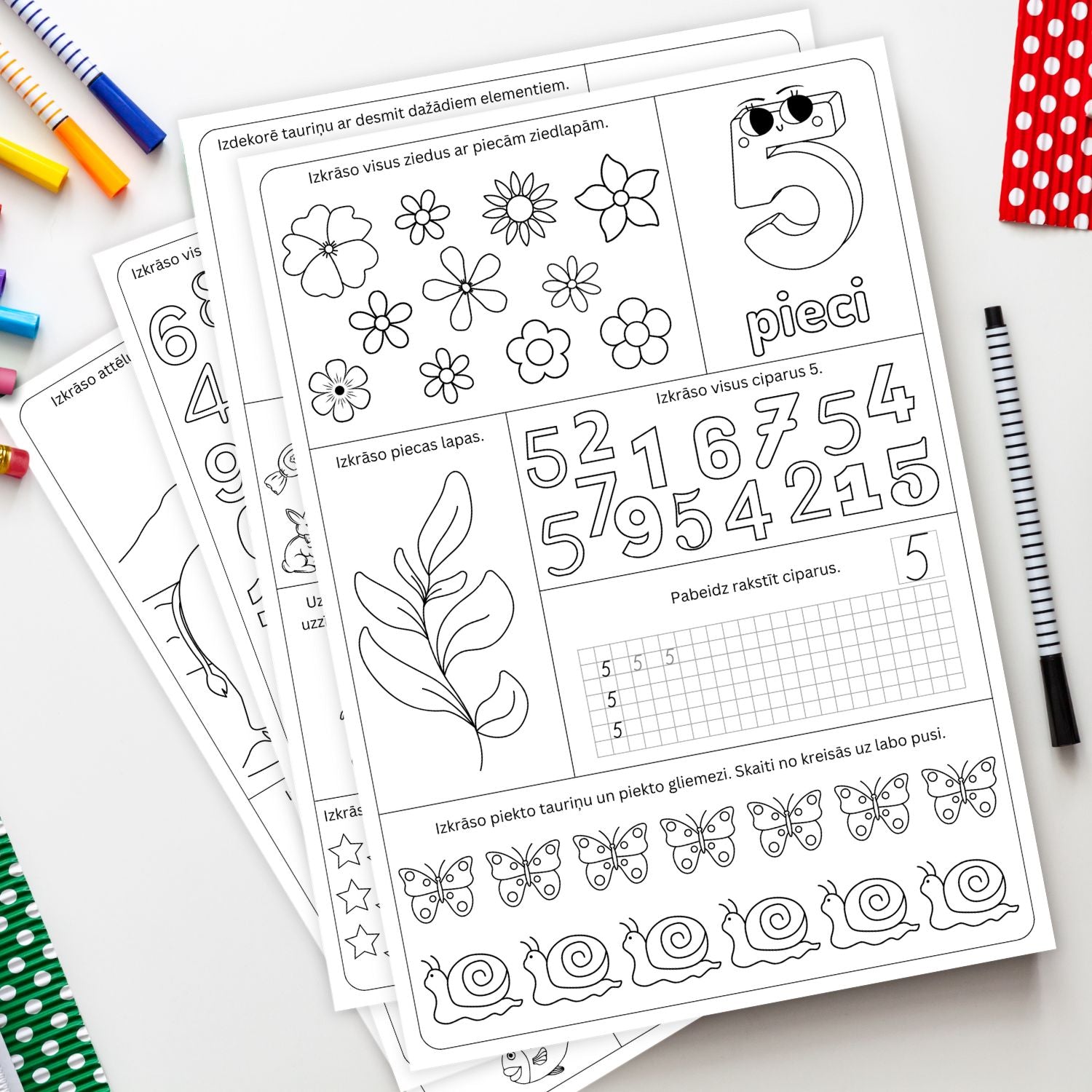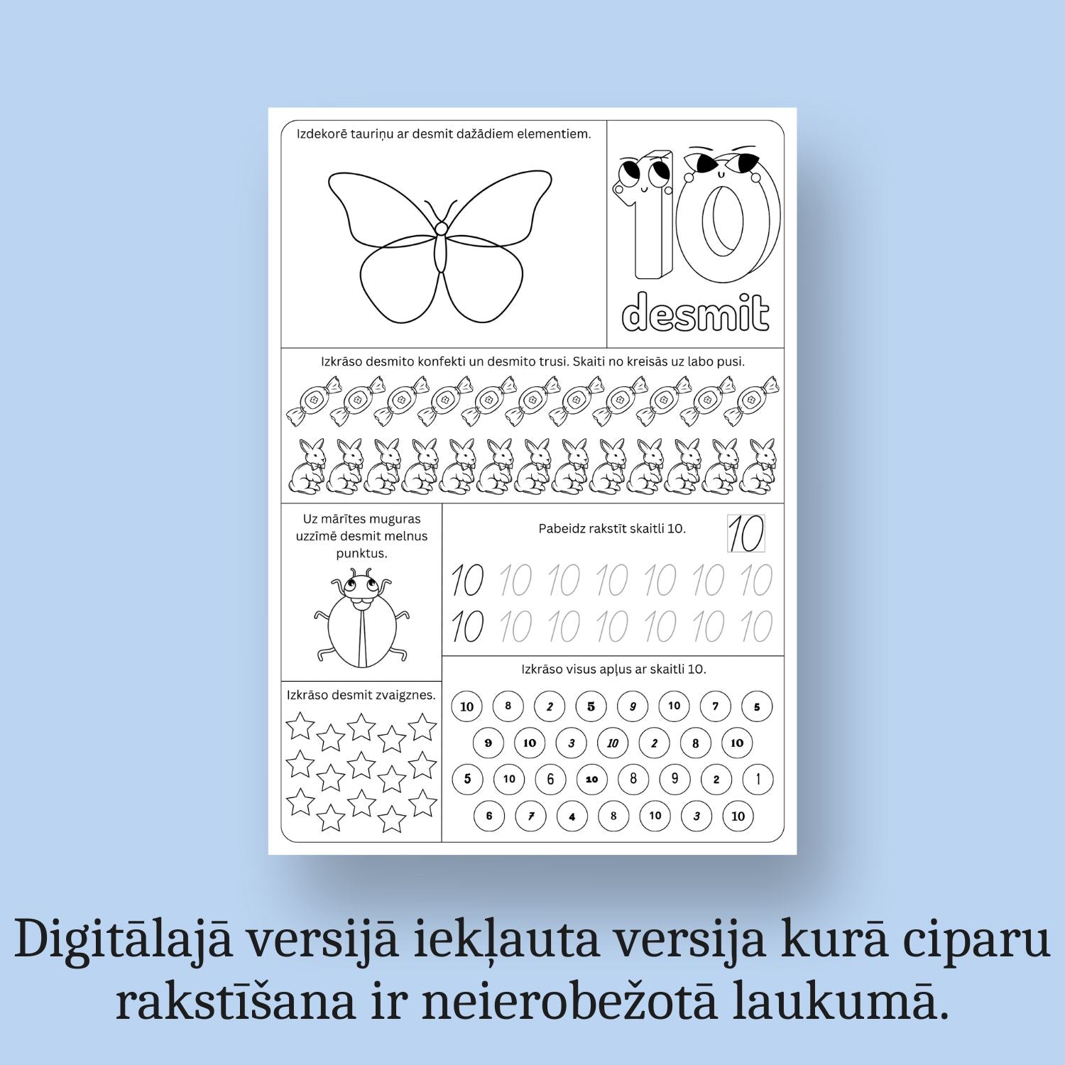 Darba lapas ar ciparu 1 līdz 10 uzdevumiem.