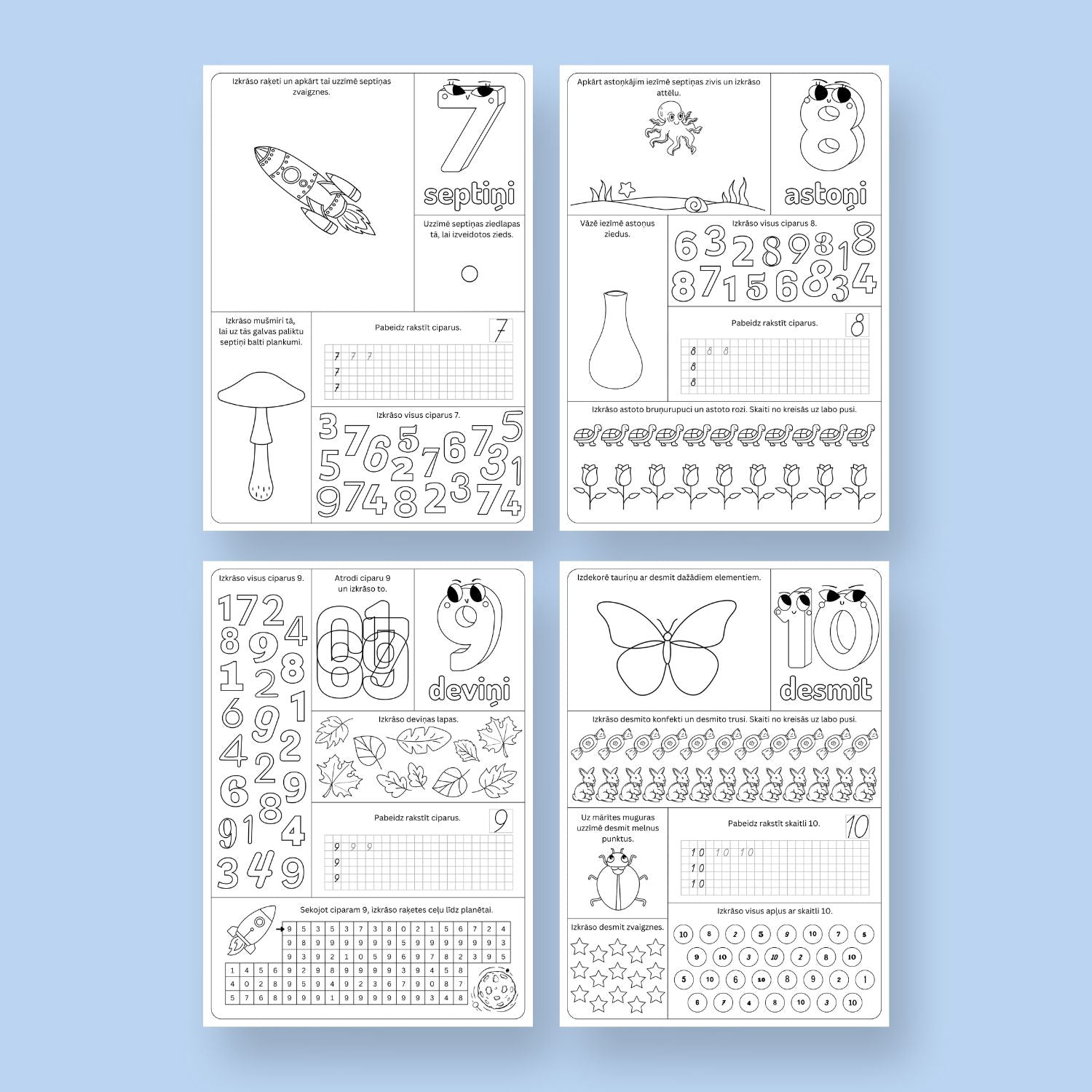 Katra darba lapa no 1 līdz 10 iekļauj uzdevumus par doto skaitli un ciparu rakstīšanas uzdevumu.