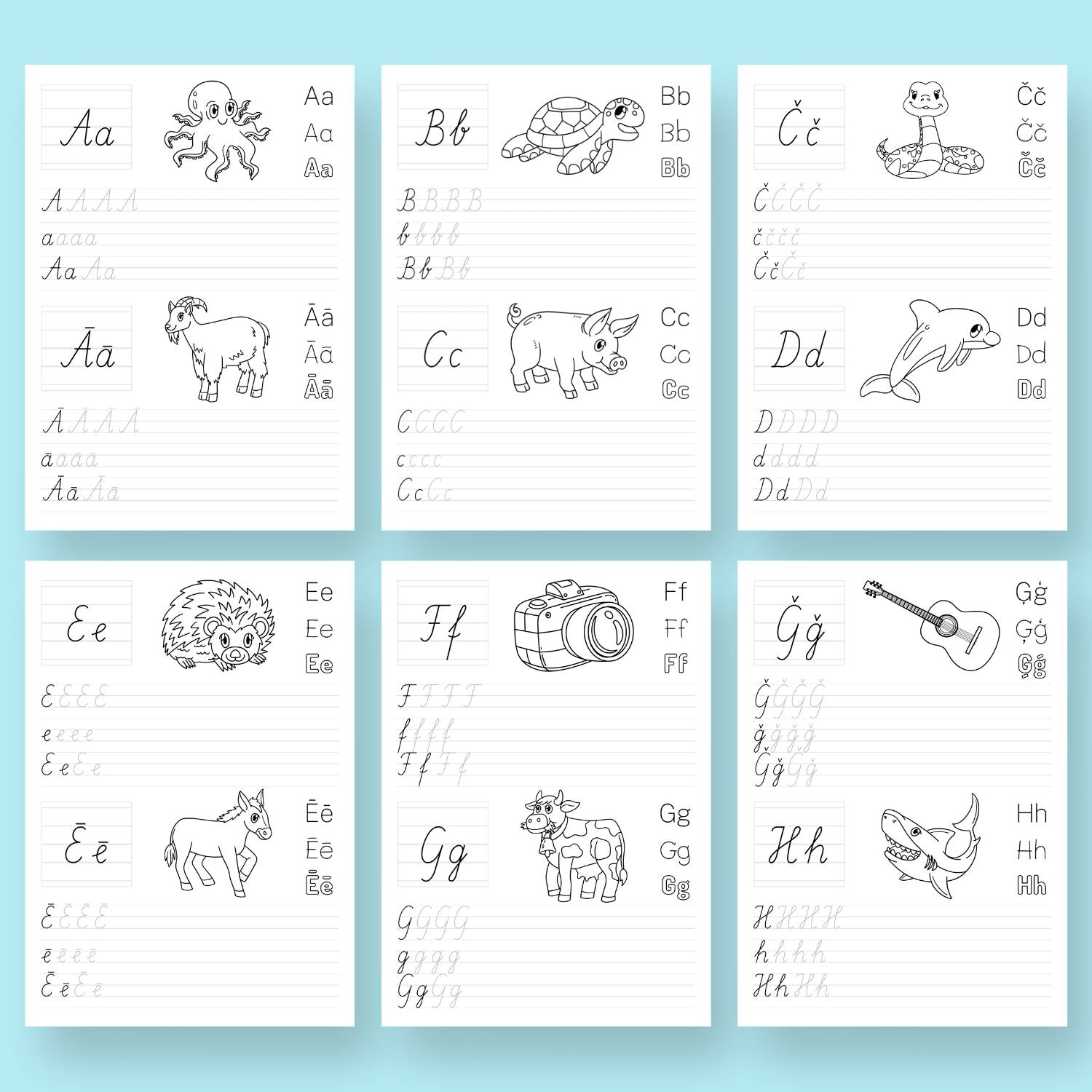 Latviešu alfabēta rakstīto burtu darba lapas.