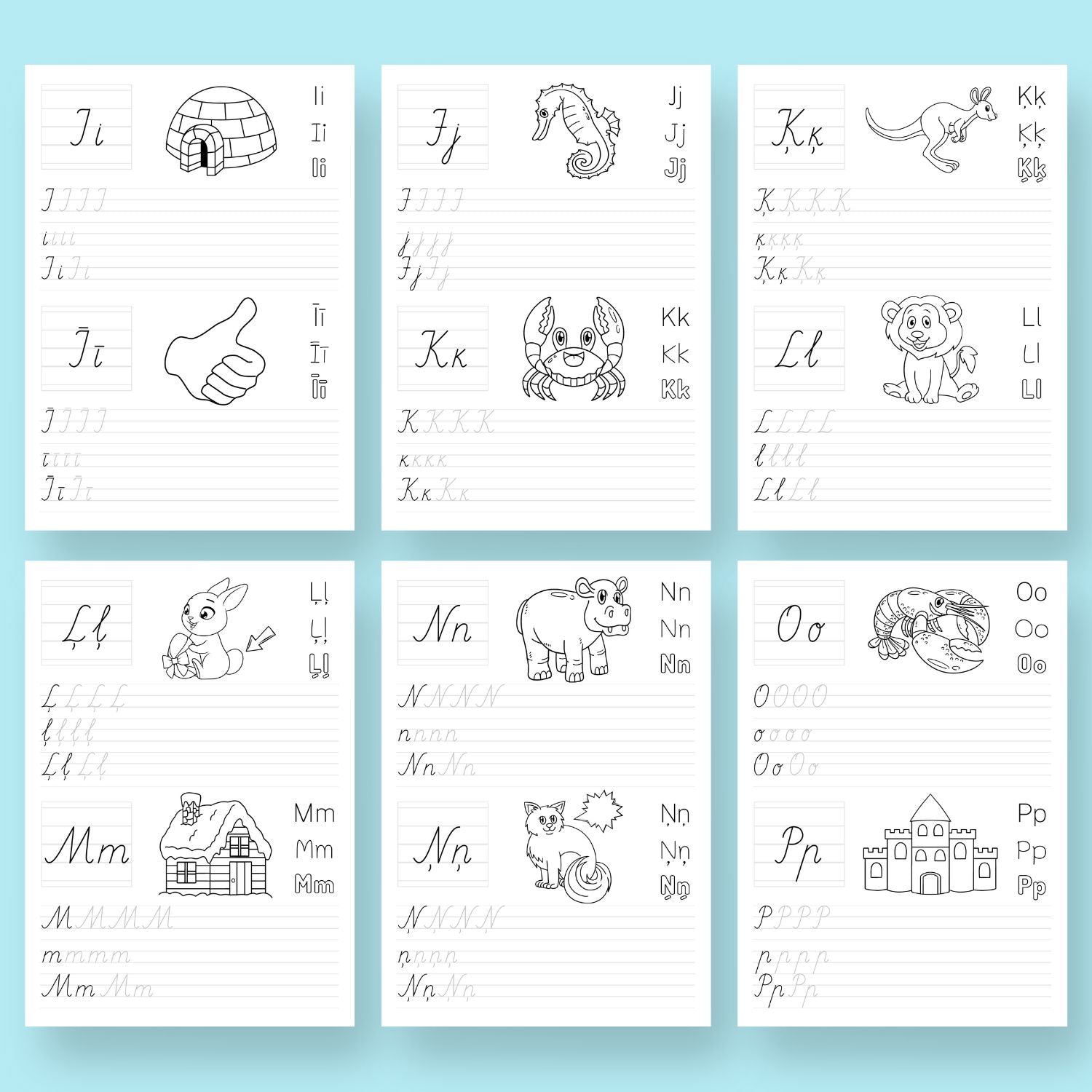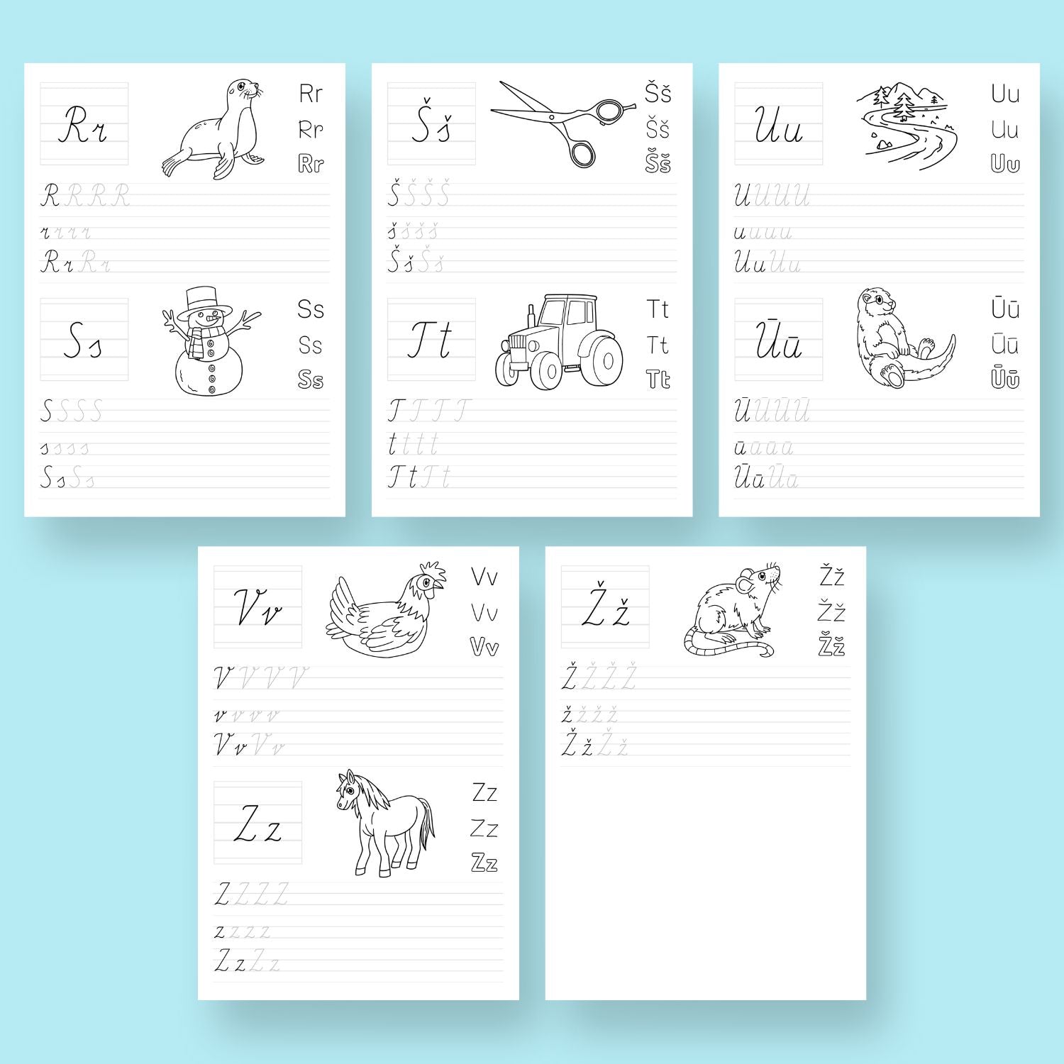 Šīs burtu rakstīšanas darba lapas būs visnoderīgākās pirmsskolas trešajā posmā vai 1. klases sākumā (5-7 g.v.).