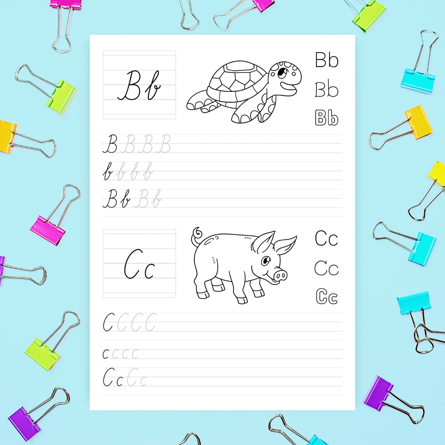 Viss latviešu valodas alfabēts, kurā katrs burts ir papildināts ar attēlu kas sākas ar doto burtu un lapas izmantojamas gan rakstīšanas, gan krāsošanas treniņam.