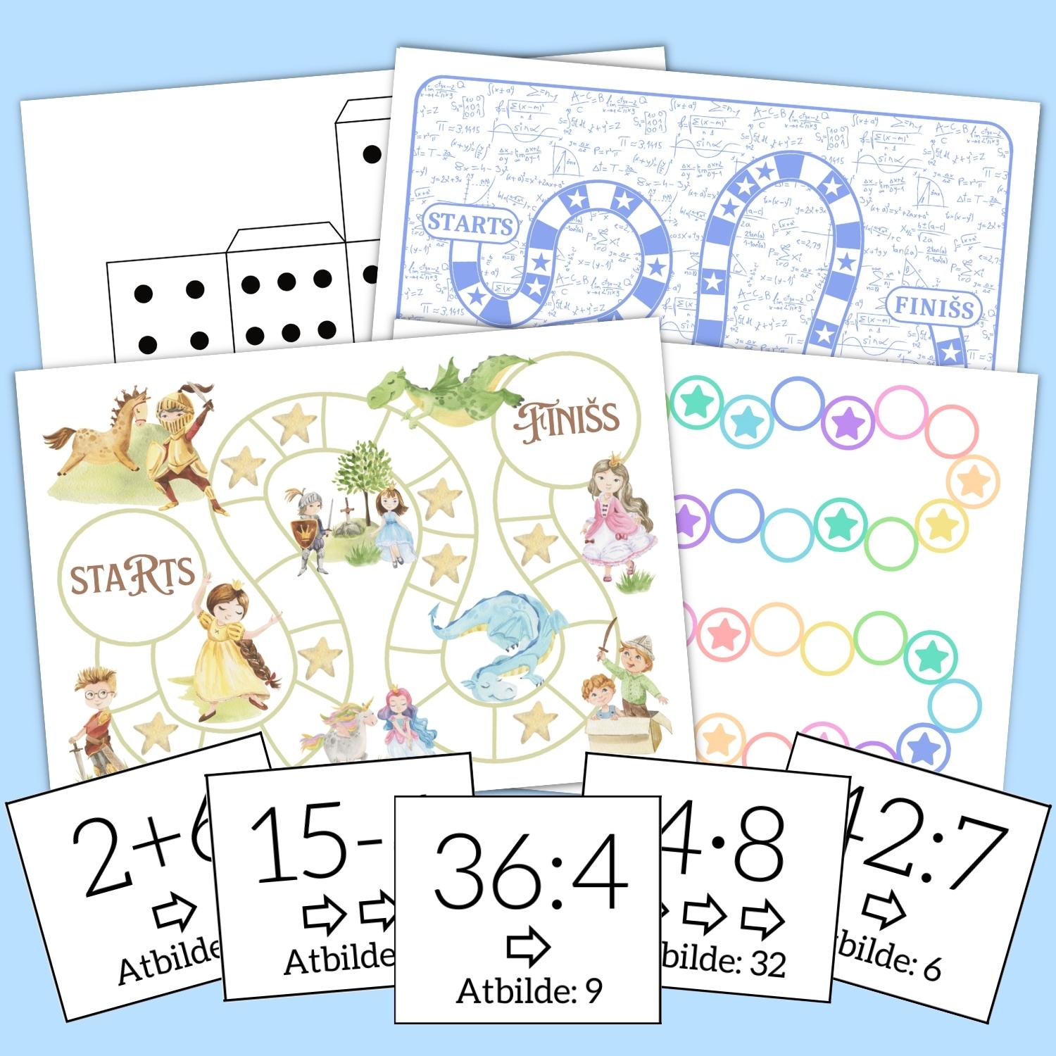 Iekļauti četri dažādi spēlējamie laukumi, 400 matemātiskie uzdevumi, metamais kauliņš un spēles noteikumi.