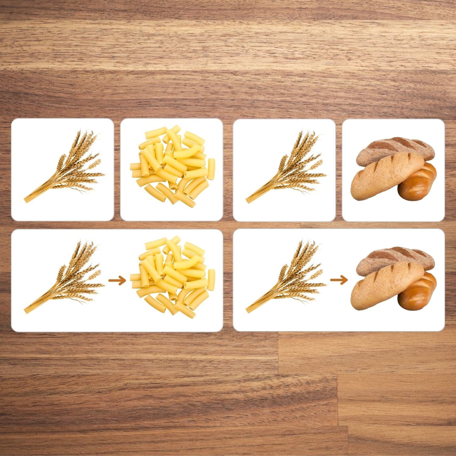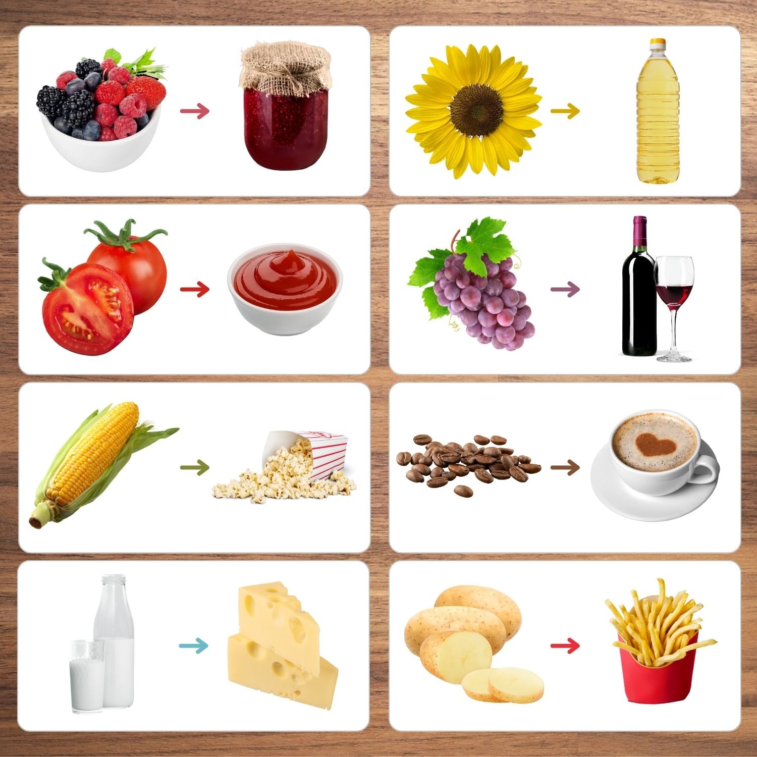 Šis mācību materiāls sastāv no 9 lpp. no kurām 2 ir darba lapas ar savienošanas uzdevumiem. Šajos uzdevumos ir pareizi jāsavieno pārtikas produkti ar to izcelsmes sastāvdaļām.