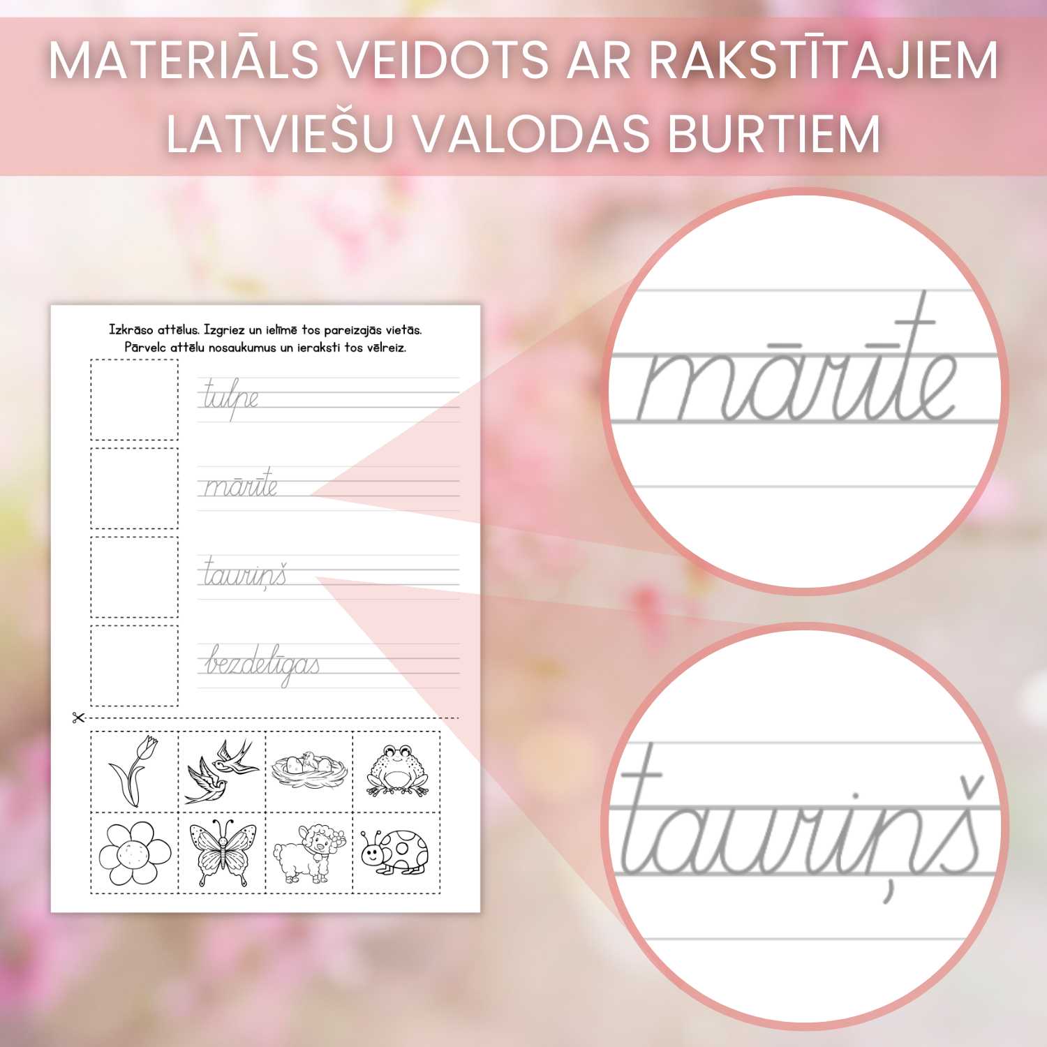 Uzdevumos būs rūtiņās pareizi jāieraksta attēla nosaukums, jāizkrāso un jāizgriež attēli, un jāielīmē tie pareizajās vietās. Tāpat būs jāpārvelk ierakstītais vārds kā arī tas jāuzraksta patstāvīgi, un pēdējā darba lapā jāuzzīmē un jāapraksta savs pavasara nodarbošanās stāsts.