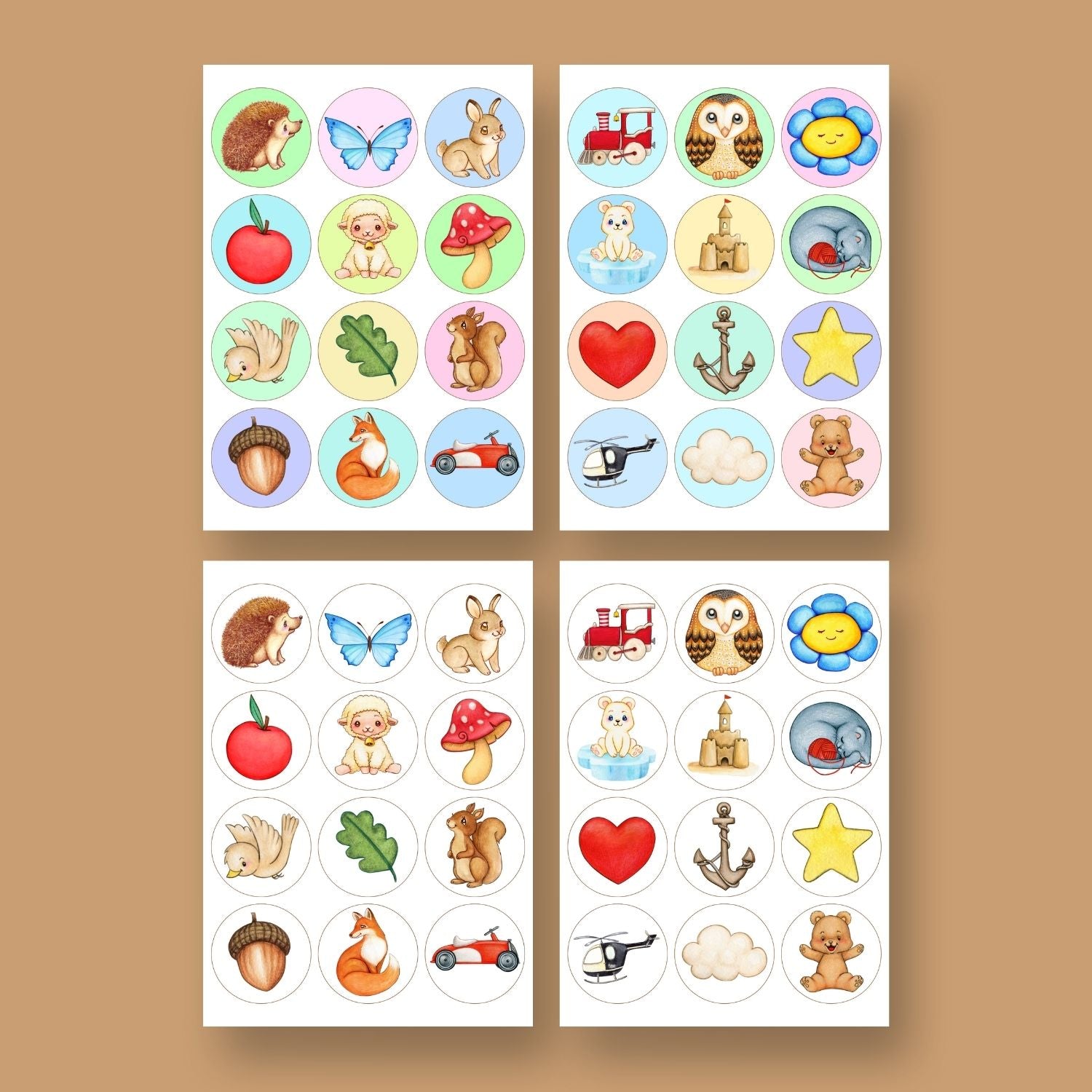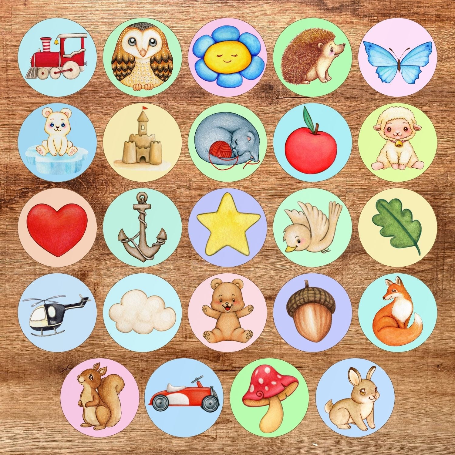 24 dažādas piktogrammas lai atzīmētu katram bērnam piederošo skapīti, krūzīti un citas lietas, kas atrodamas grupiņā.