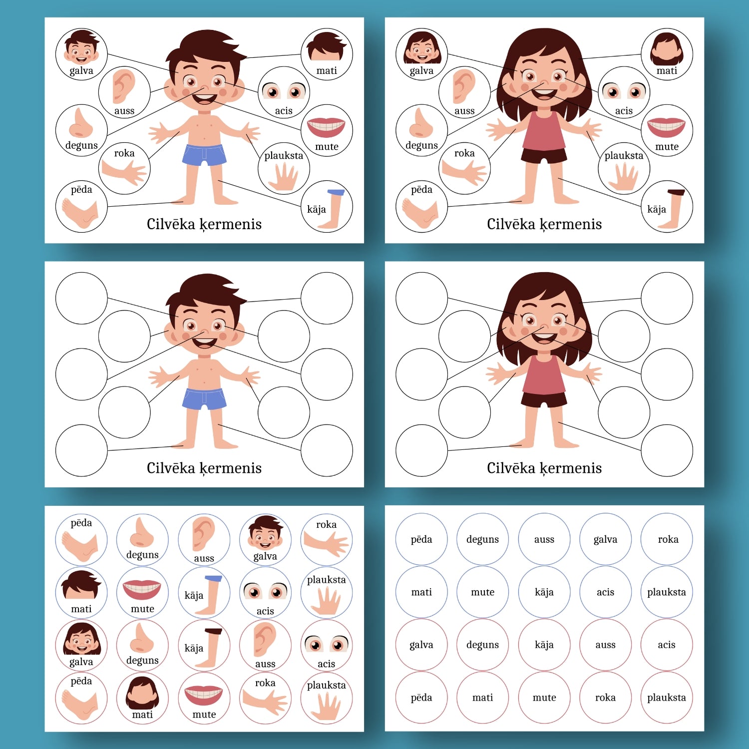 Plakāti ar zēnu un meiteni, kuros norādītas to ķermeņa daļas.