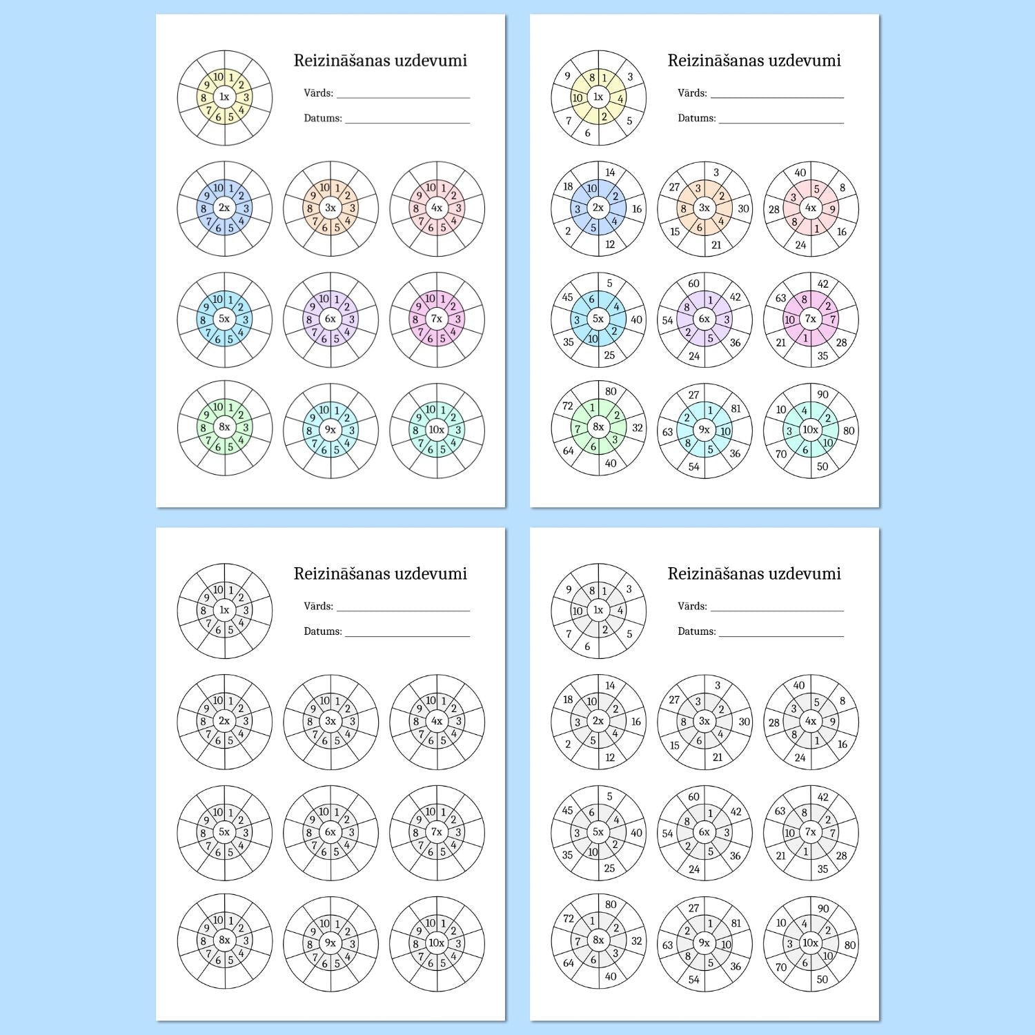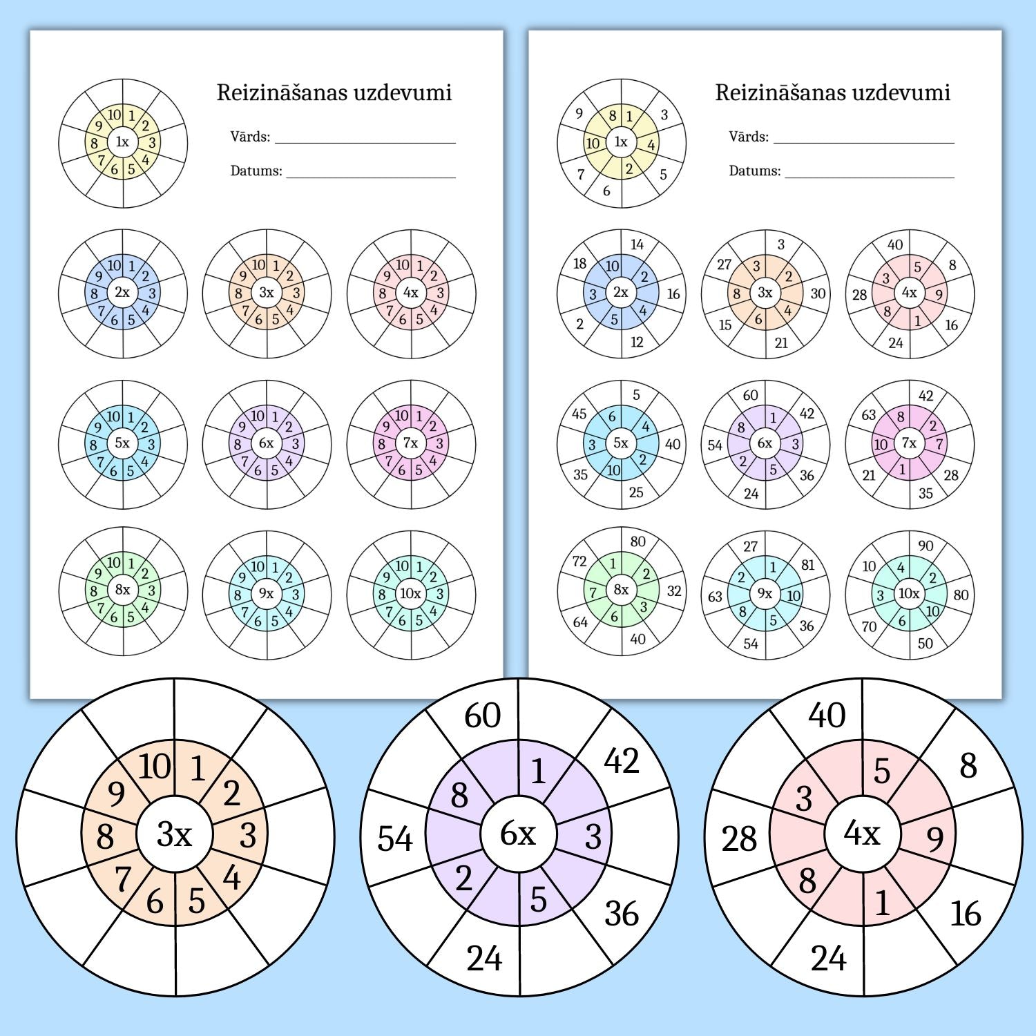 Viena darba lapa sastāv no 10 apļiem, kuru centrā ir cipari no 1 līdz 10, un katrs no šiem skaitļiem jāreizina ar cipariem no 1 līdz 10 un atbilde jāieraksta brīvajā vietā lielākajā aplī.