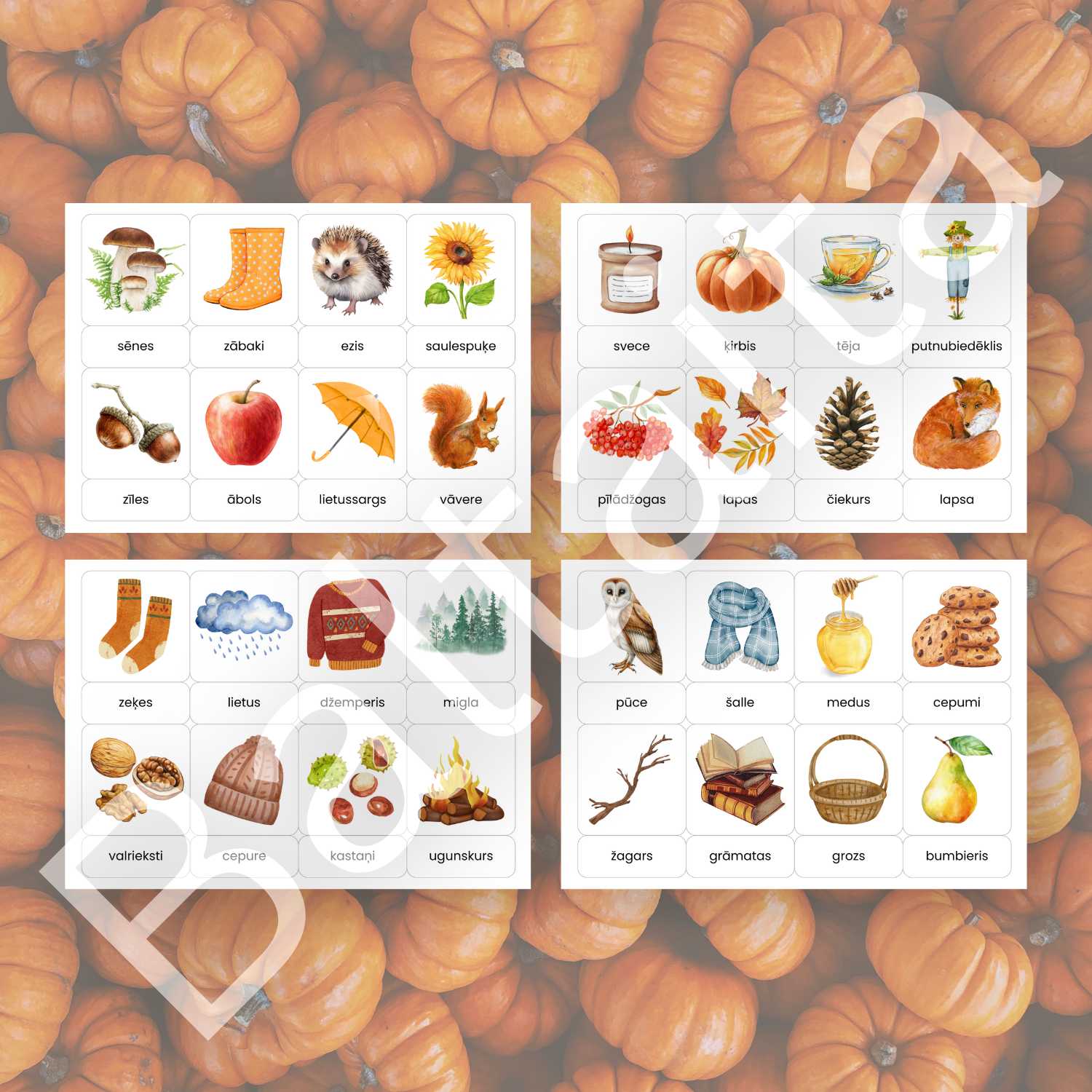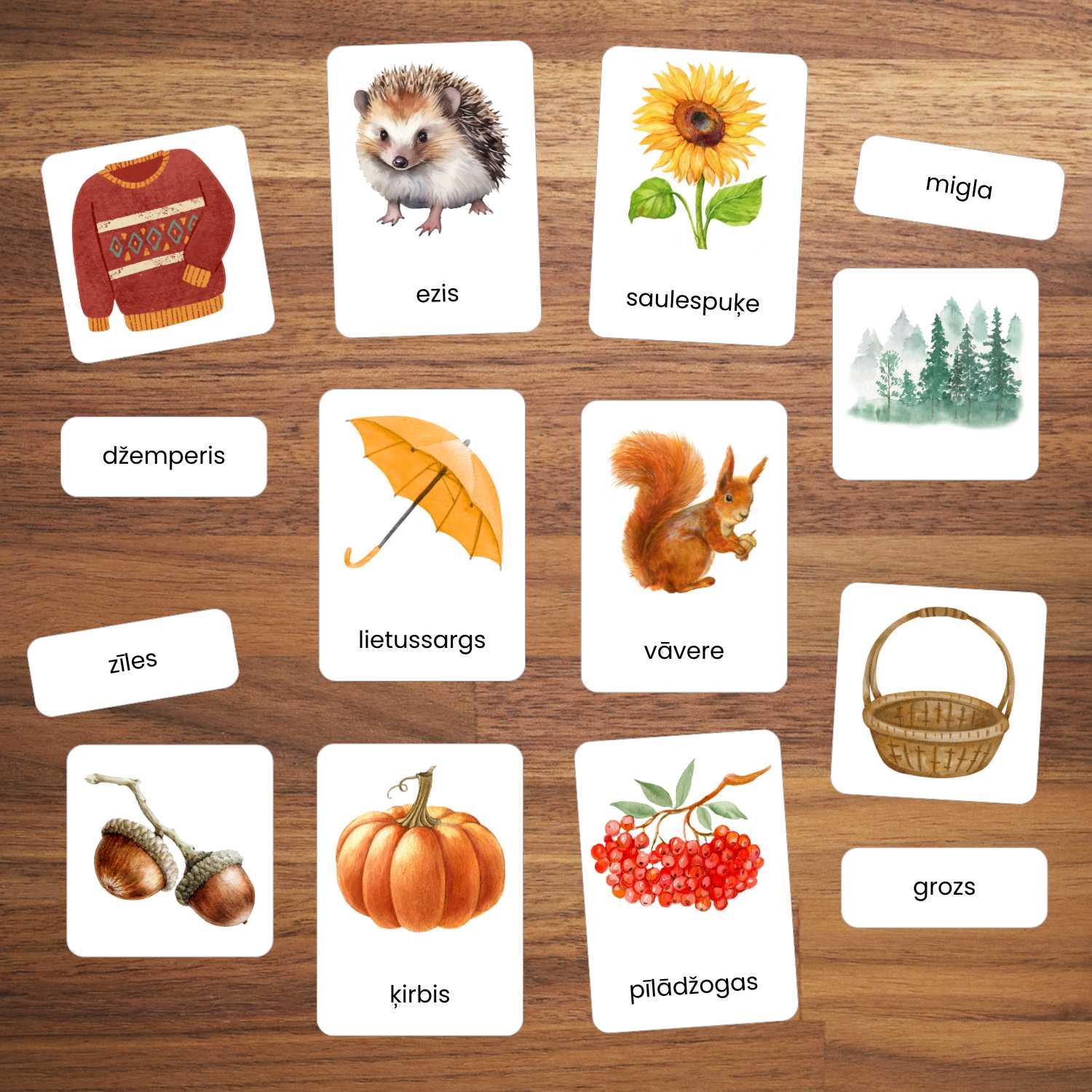 Viendaļīgas un divdaļīgas kartītes ar 32 dažādiem attēliem rudens tematikā.
