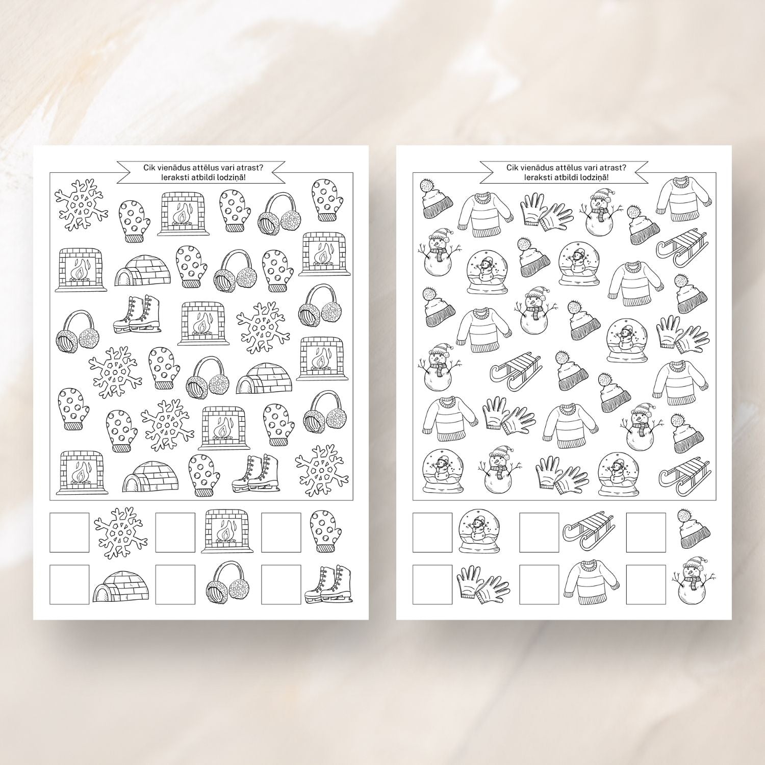 2 darba lapas ar attēlu skaitīšanas un atbildes ierakstīšanas uzdevumiem.