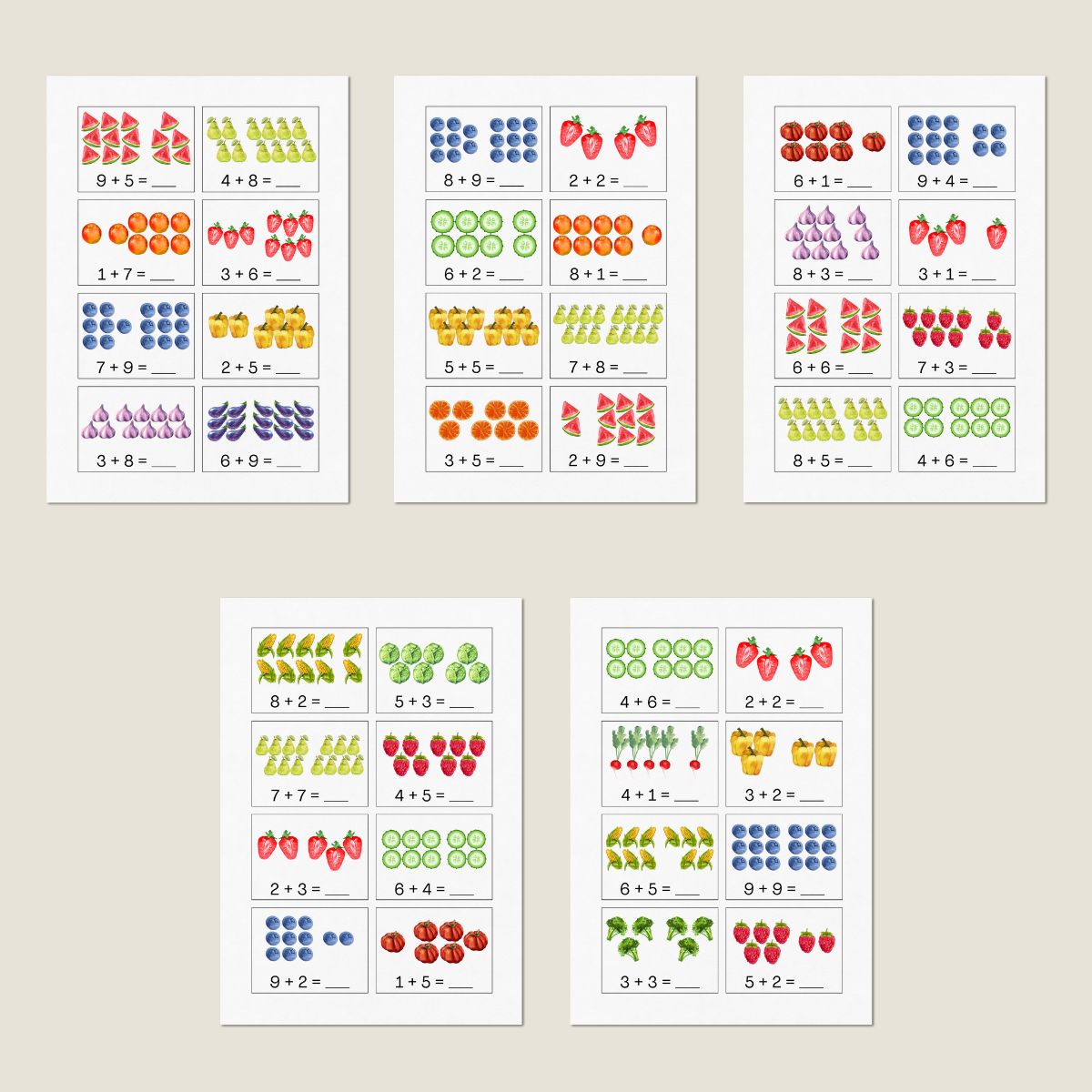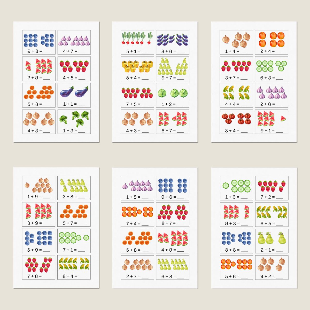 Šīs 11 darba lapas ir veidotas iekļaujot visus uzdevumus no 1+1 līdz 9+9.