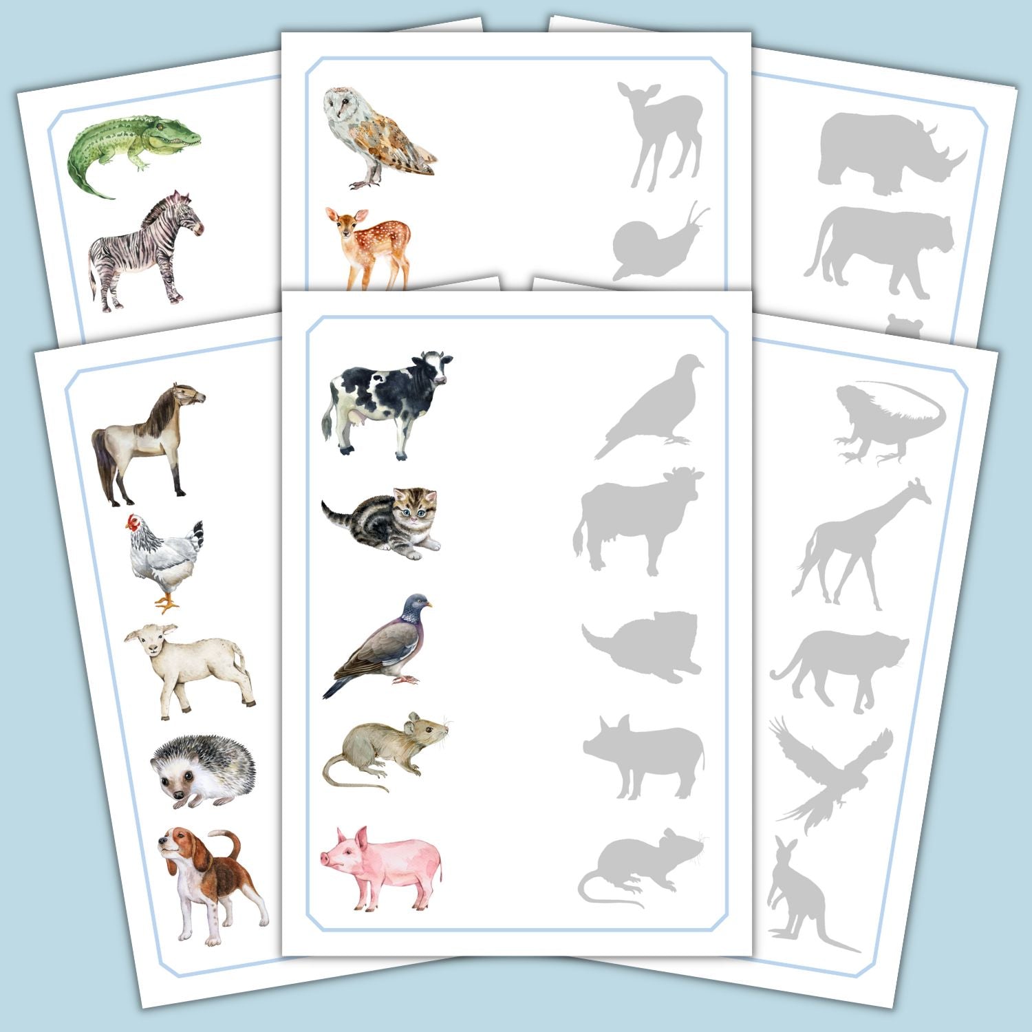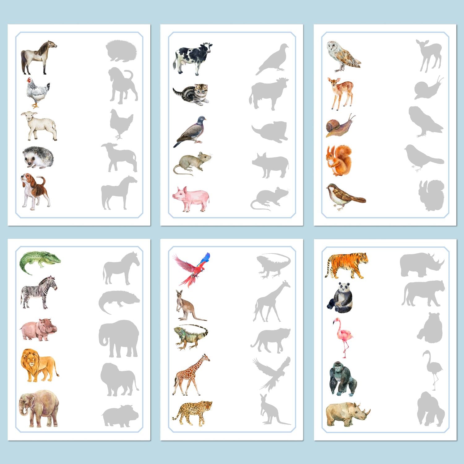 Ēnu savienošanas darba lapas kurās uzdevums ir pareizi ar līniju savienot attēlā redzamo dzīvnieku ar tā ēnu.