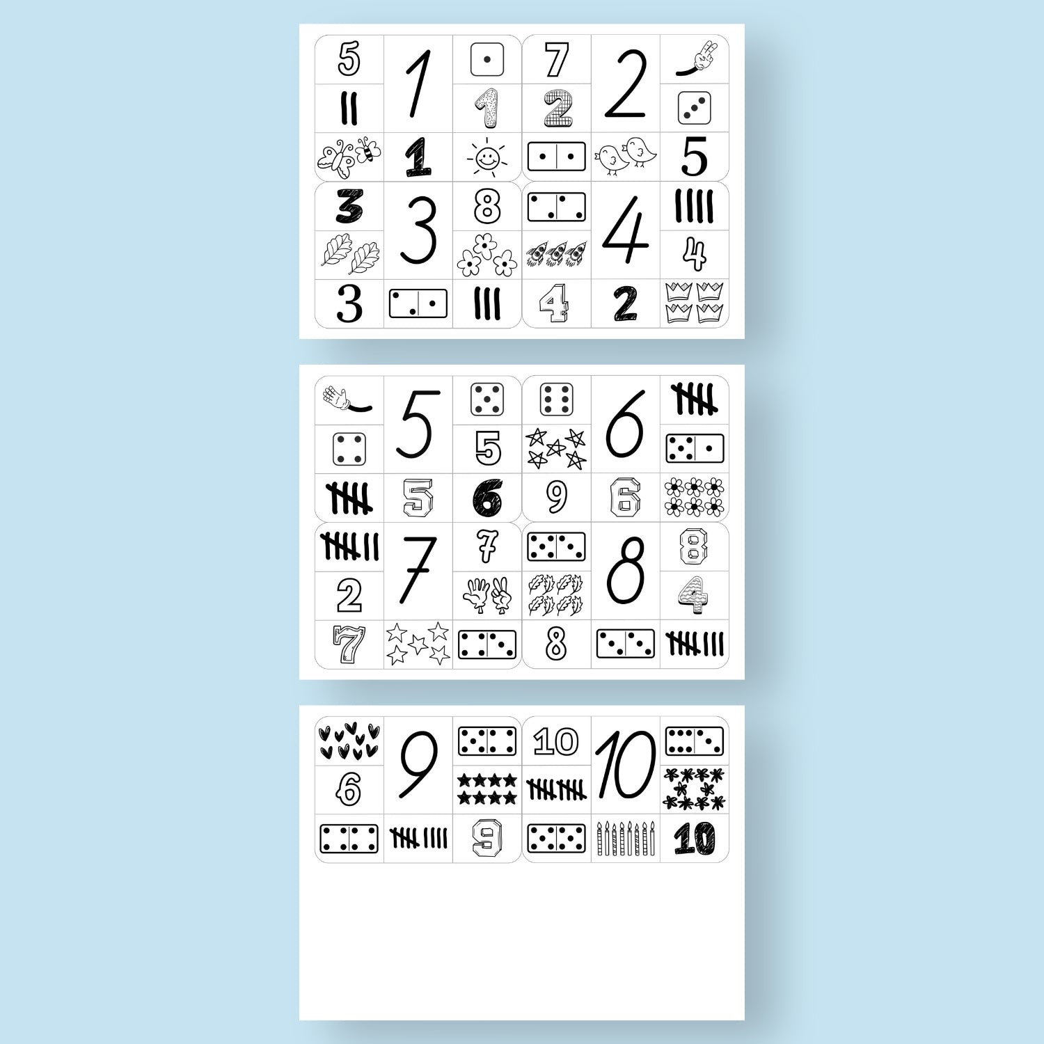 Katra kartīte ietver ciparu no viens līdz desmit un citus attēlus, daži no kuriem atbilst dotajam skaitlim. Uzdevums ir pareizi norādīt skaitlim atbilstošos attēlus.