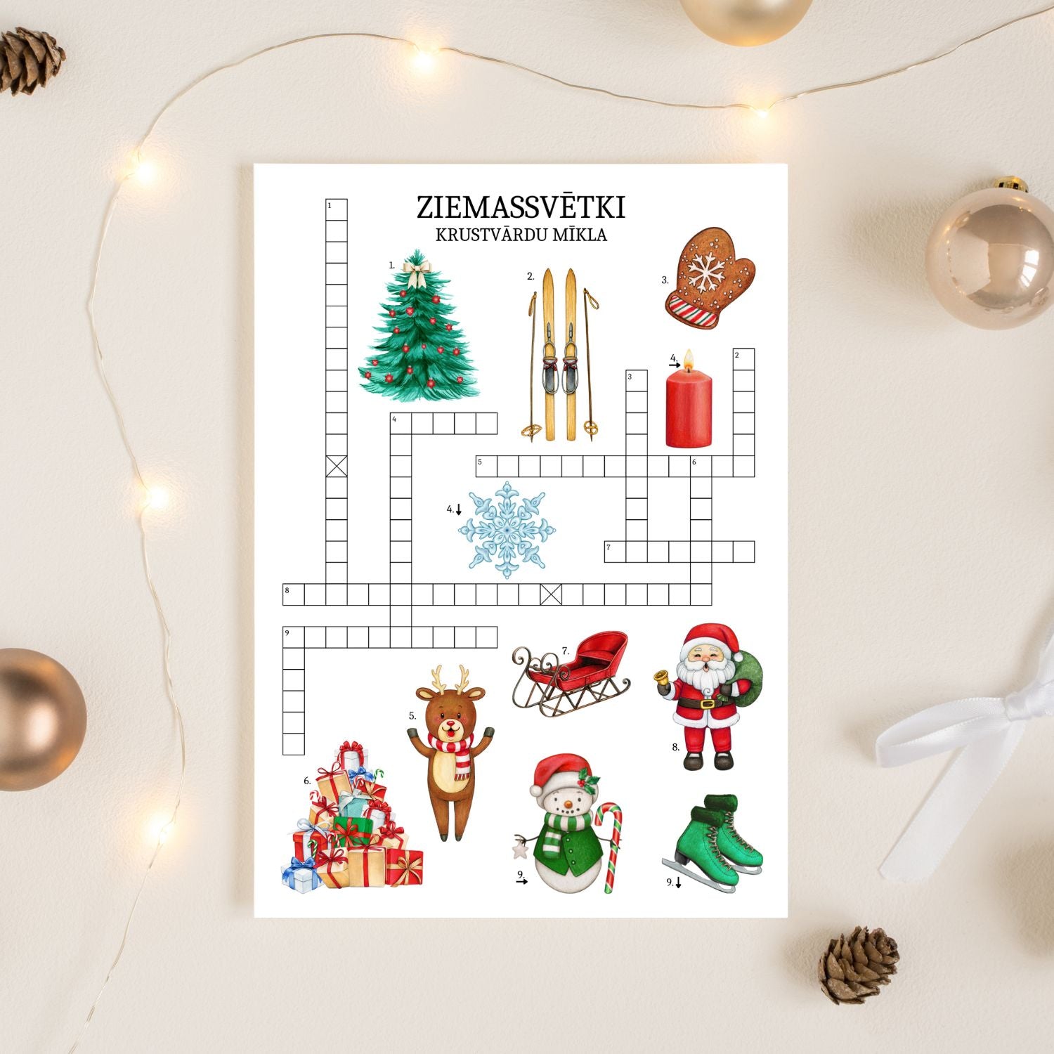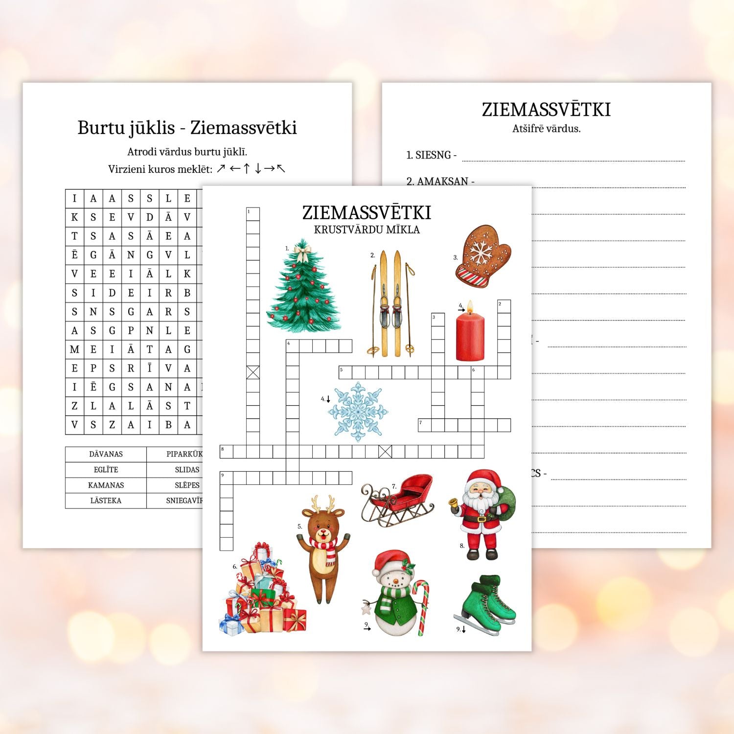 Šīs interesantās vārdu spēles ietver krustvārdu mīklu, kurā vārdi minami pēc attēliem, burtu jūkli – kurā jāatrod 12 ar Ziemassvētku tematiku saistīti vārdi kā arī vārdu šifrēšanas darba lapa kurā jāatšifrē 14 dažādi vārdi kuru burti ir sajaukti vietām.