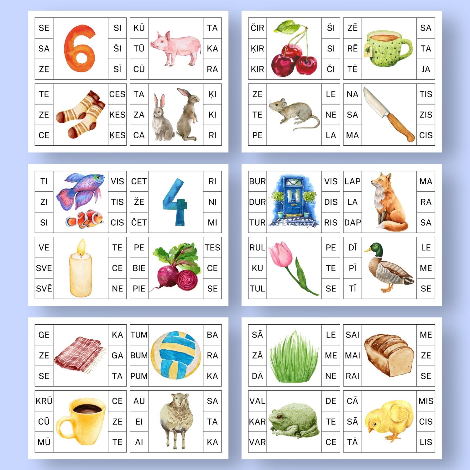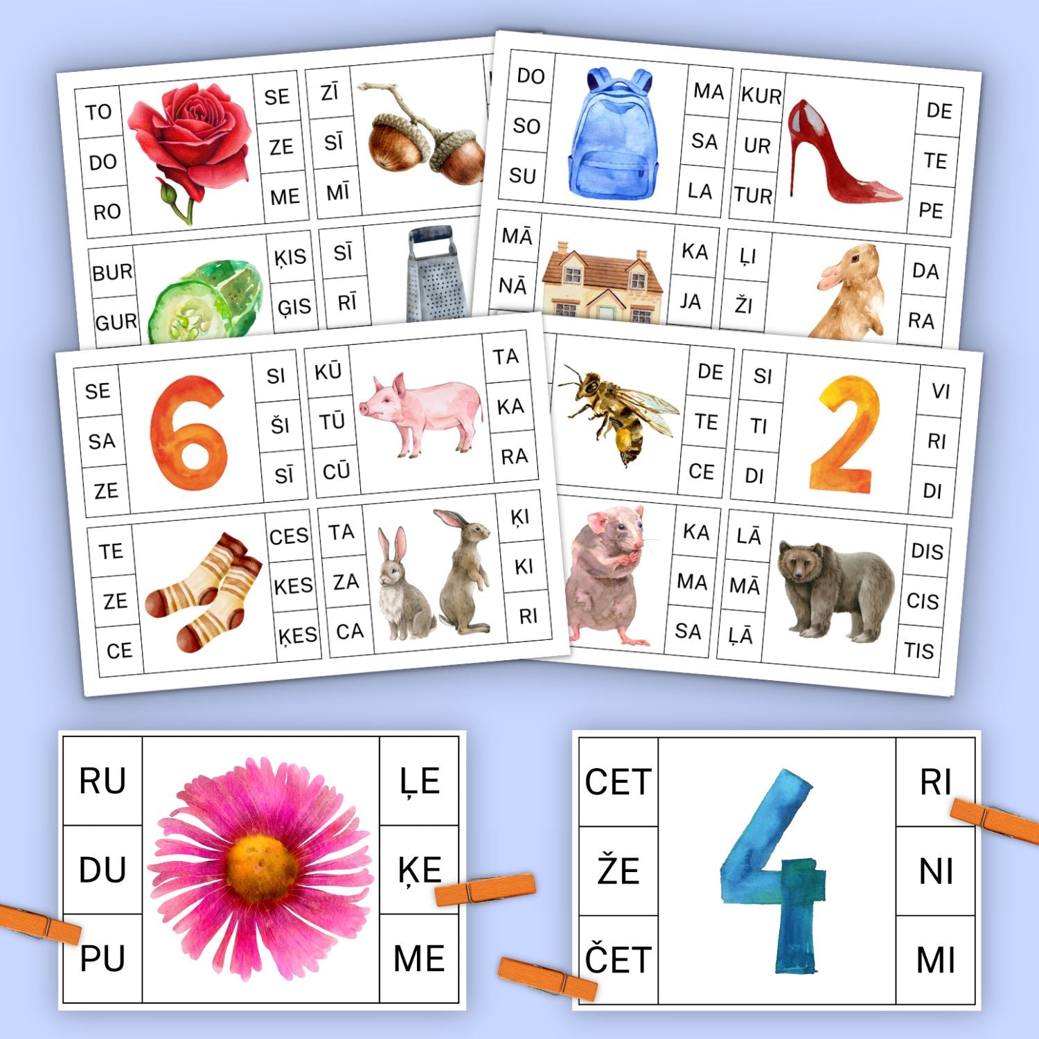 48 krāsainas kartītes zilbju knaģu spēlei. Uzdevums izpildāms pareizi ja tiek atzīmētas pareizās zilbes.