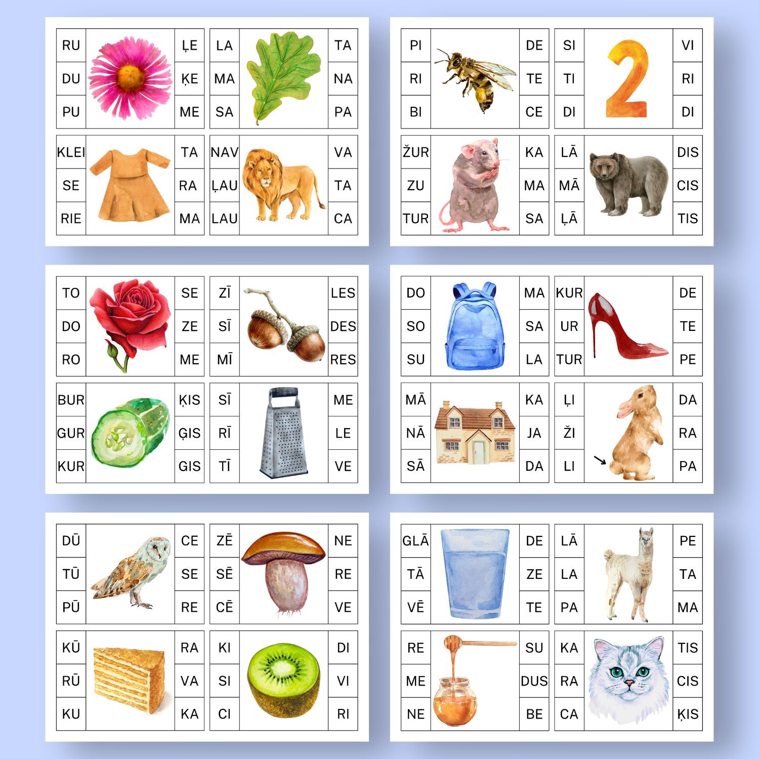 Mācību materiāls sastāv no 48 dažādiem divu zilbju vārdiem un katra kartīte ir veidota ar krāsainu zīmējumu.